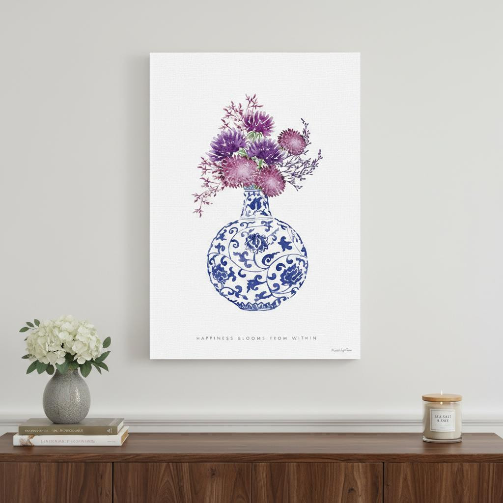 The 24 inches x 16 inches blue and white happiness floral vase canvas wall art is the perfect decorative accessory for your home. This print is a visual artistic expression that allows you to decorate your space in style. Reproduced for you on canvas, this hanging decorative accent will be a trendy and fashionable way to dress your walls. Adding this hanging wall art to your space to make your room feel more finished and attractive. Instantly liven up your space with this art that brings color and dimension to your walls. 24 inches H x 16 inches W x 1.25 inches D