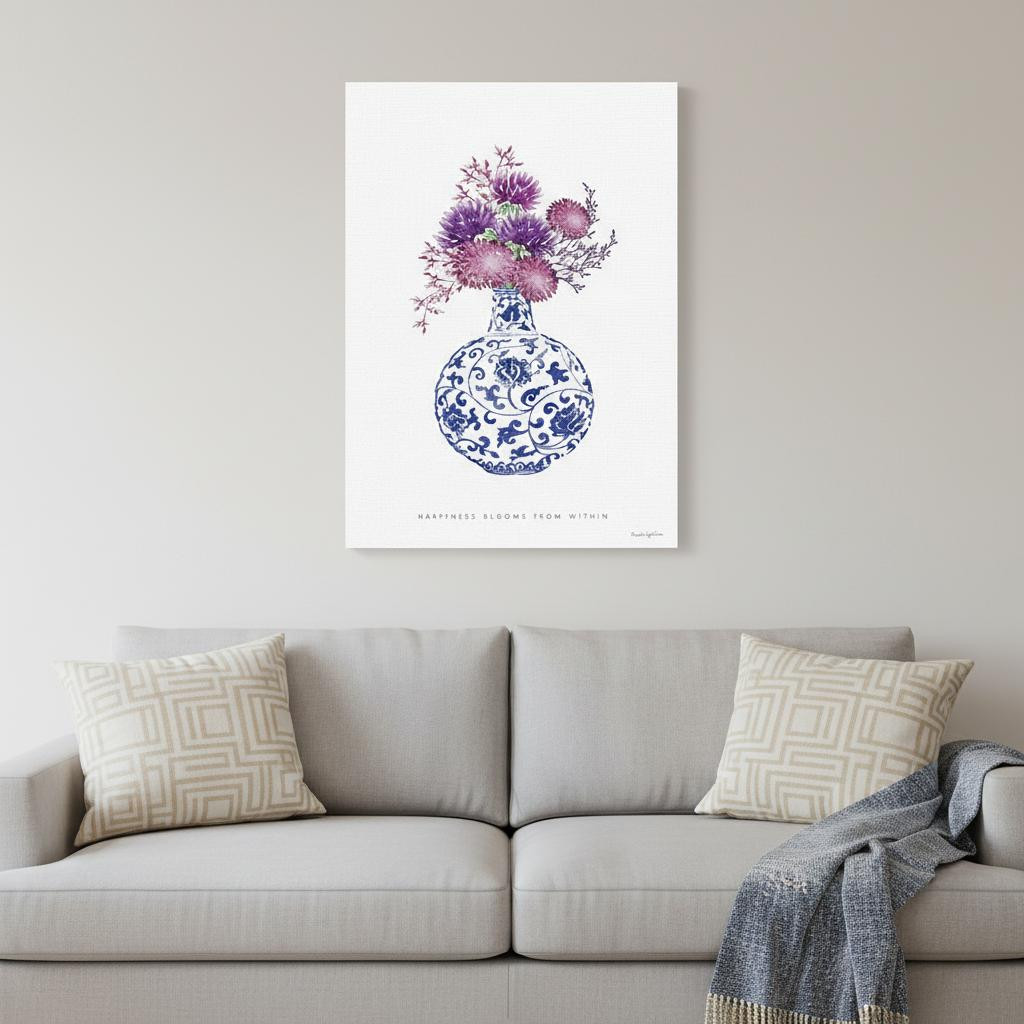 This 36 inches x 24 inches blue and white happiness floral vase canvas wall art will add a beautiful decorative accent to your decor. This print is a visual artistic expression that allows you to decorate your space in style. Reproduced for you on canvas, this hanging decorative accent will be a trendy and fashionable way to dress your walls. Adding this hanging wall art to your space to make your room feel more finished and attractive. Utilize this opportunity to create a focal point in the room with this fabulous wall decor option. 36 inches H x 24 inches W x 1.25 inches D