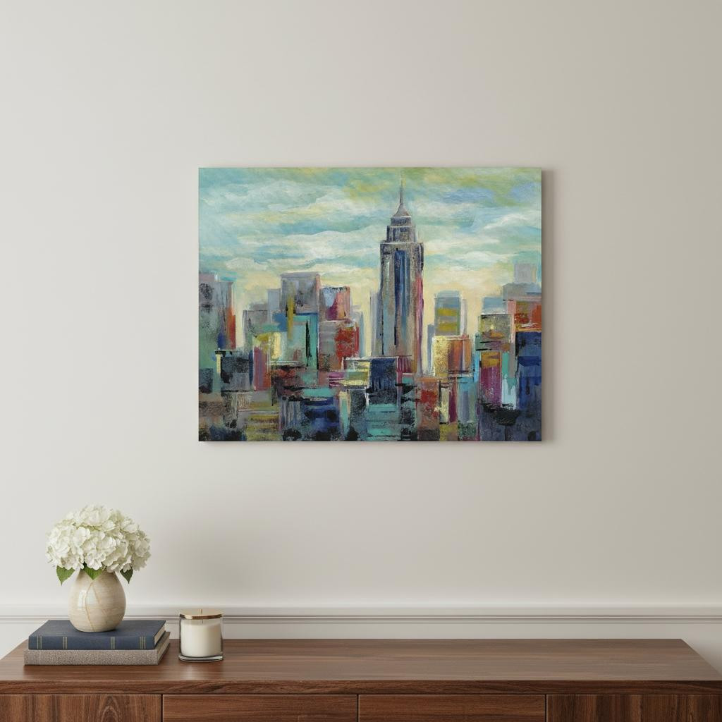 The 30 inches x 24 inches vibrant nyc skyline canvas wall art is the perfect decorative accessory for your home. This print is a visual artistic expression that allows you to decorate your space in style. Reproduced for you on canvas, this hanging decorative accent will be a trendy and fashionable way to dress your walls. Hang on your wall to add some up to date fashion and decoration. Utilize this opportunity to create a focal point in the room with this fabulous wall decor option. 30 inches H x 24 inches W x 1.25 inches D