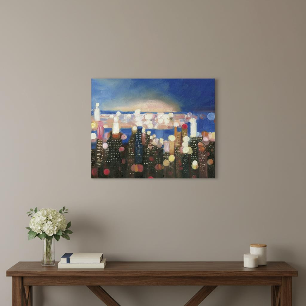 Unique and decorative, this 30 inches x 24 inches watercolor city lights on the horizon canvas wall art will leave a lasting impression. This print is a visual artistic expression that allows you to decorate your space in style. Reproduced for you on canvas, this hanging decorative accent will be a trendy and fashionable way to dress your walls. Hang on your wall to add some up to date fashion and decoration. Utilize this opportunity to create a focal point in the room with this fabulous wall decor option. 30 inches H x 24 inches W x 1.25 inches D
