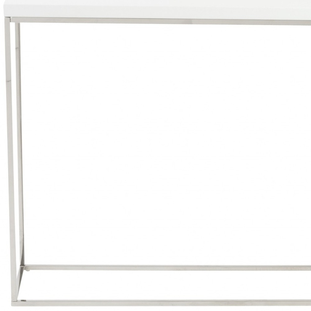Transform your home with our elegant and versatile 35-inch white and silver frame console table. Don't miss out on the perfect finishing touch for your home. This rectangular table is ideal for up against the wall, can free stand in a room, or sit behind the sofa perfectly. This table has a top made with white manufactured wood that is known for durability and easy maintenance. The frame is made of durable, solid metal. Ideal for living rooms, bedrooms, home offices, and lounge areas, this console table is not only good looking but multi-functional and practical addition to your space. 29.93-inch H x 35.44-inch W x 9.85-inch D