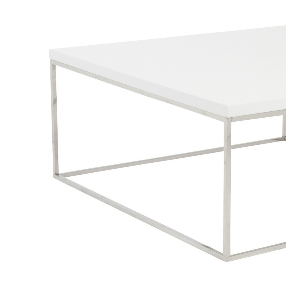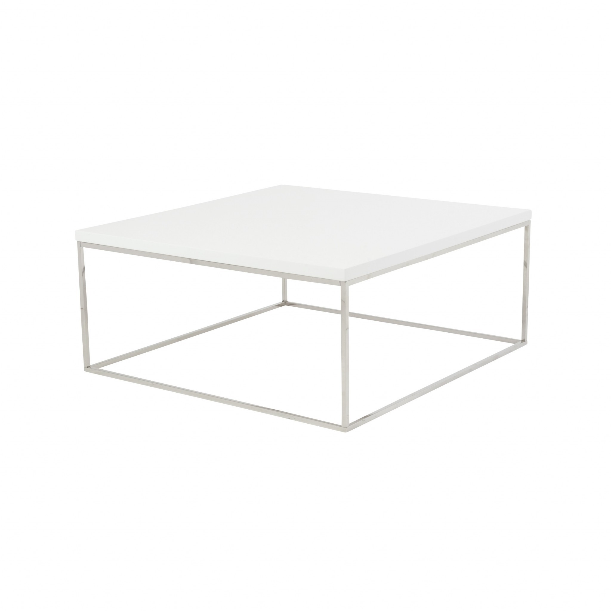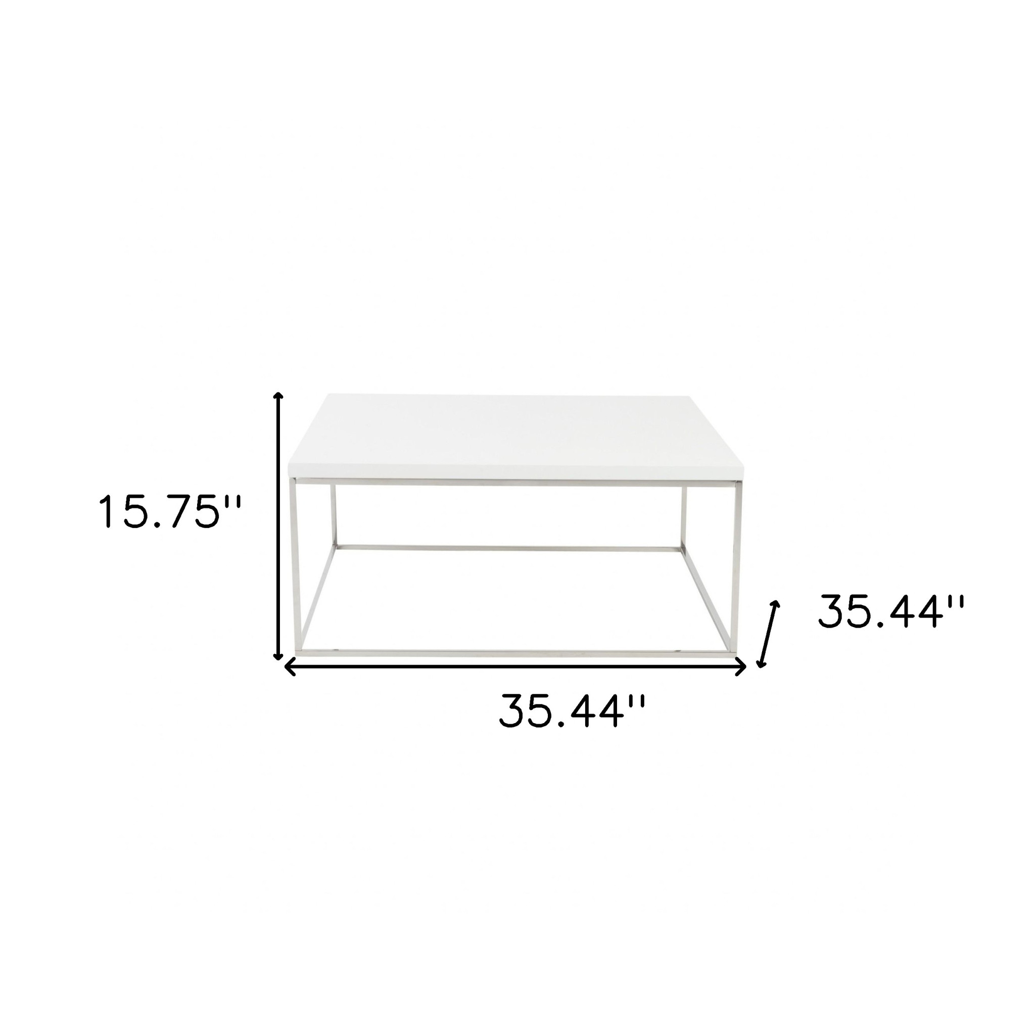 This stylish 35-inch white and silver wood and metal square frame coffee table is sure to inspire compliments no matter where it sits. A silver metal frame is finished off with a white manufactured wood top that is the epitome of quality construction and design. This square table utilizes its unique shape to give your room a modern geometric accent. If you're looking for something that can fit into a living area, bedroom, or office, this coffee table is for you. 15.75-inch h x 35.44-inch w x 35.44-inch d.
