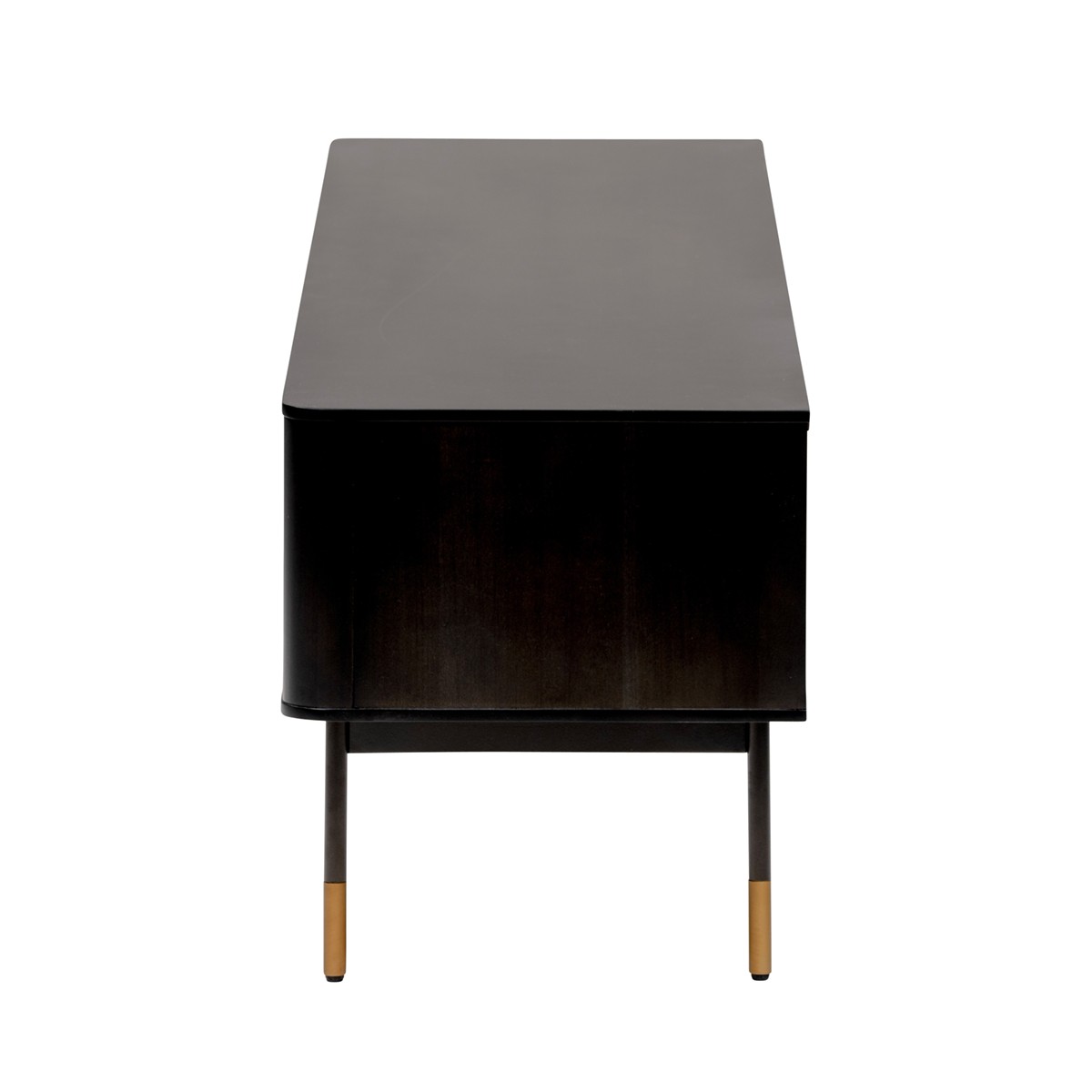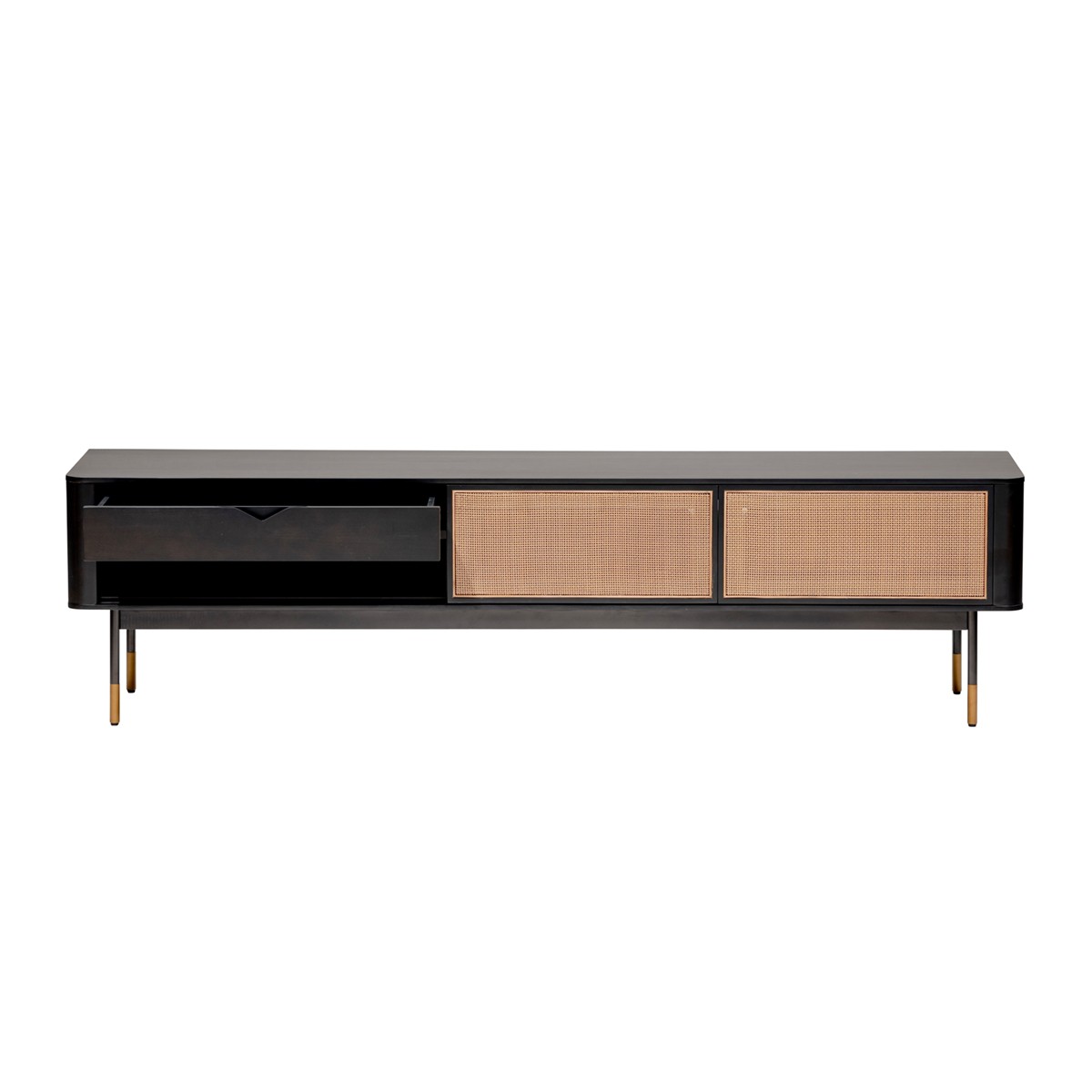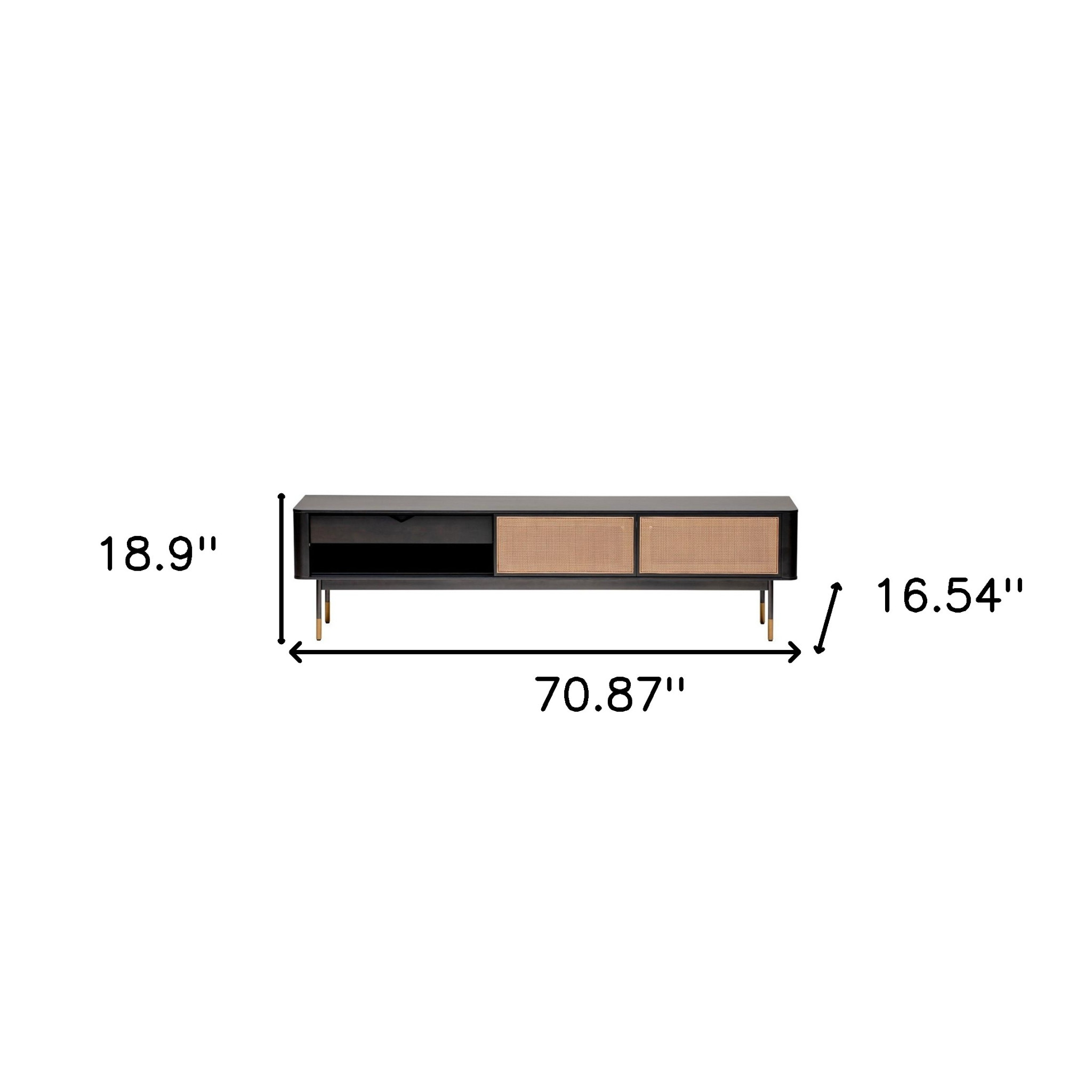 The perfect way to add a touch of natural contemporary design to your space, this Black Wood and Wicker Media Stand will elevate your living space instantly. The main body of this media stand is made from solid wood and colored to a matte black finish. Inside the main body there are two horizontal shelves, one hollow and one covered with a door. Next to this there are two compartments that have light brown wicker doors. The base of the stand has a simple four legged design with each leg having gold accents on the bottom. This media stand will not only look great but also provides a lot of storage space. 18.9" H x 70.87" W x 16.54" D