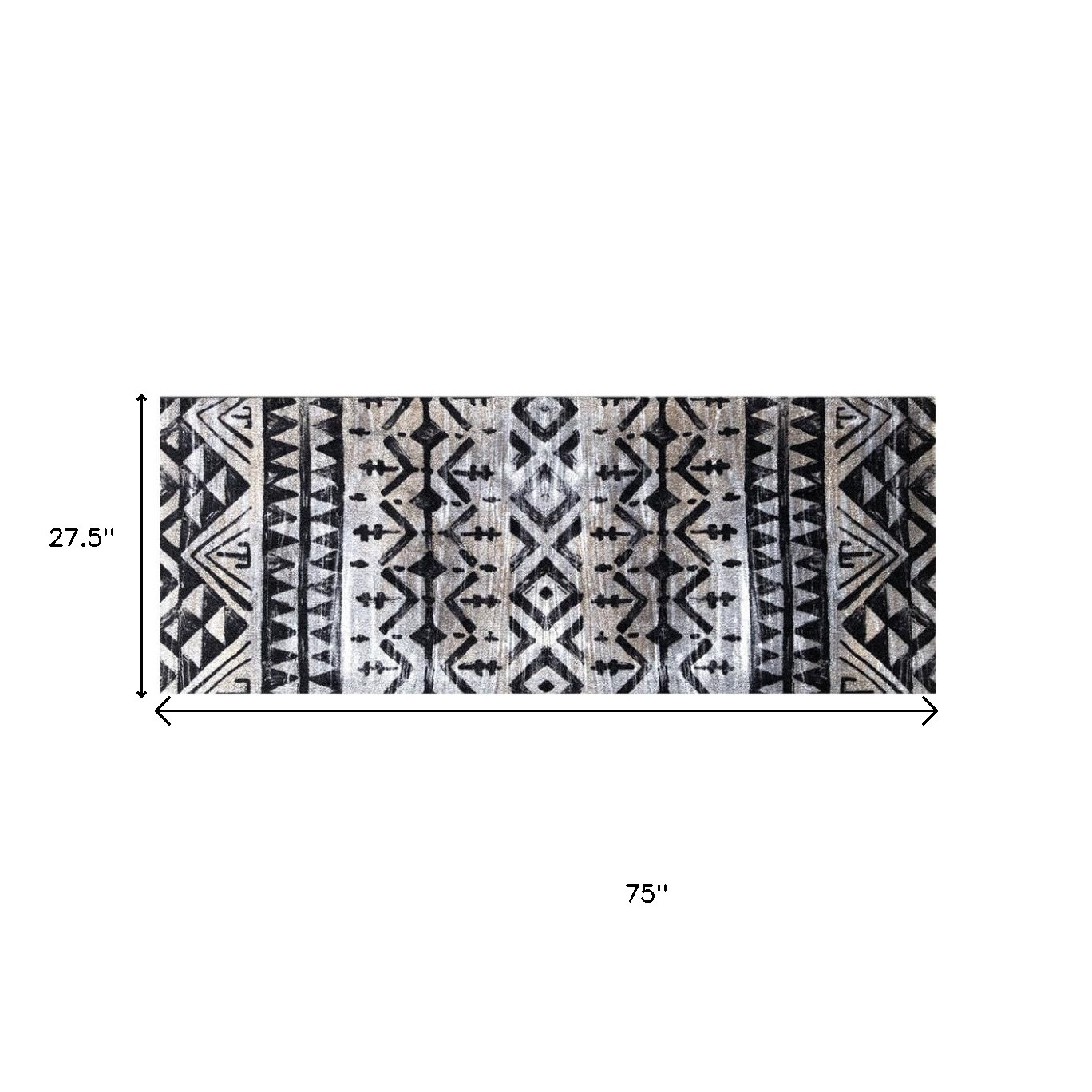 This low profile Black and Gray Aztec Washable Floor Mat Runner Rug is a game changer. A fade resistant, slightly distressed, modern abstract tribal design with netural shades of gray, black, silver, and brown provides a fashion forward look for a mat that is super sturdy and yet can easily be thrown into the washer and dryer to clean. The premier formula rubber backing used makes this nylon rug slip resistantr with no need for an additional pad, and the backing will hold up during the wash and dry! The low profile means it easily fits under doors. Combine fashion and style with real life functionality with this great area rug/door mat. 27.5" x 75" x .3"