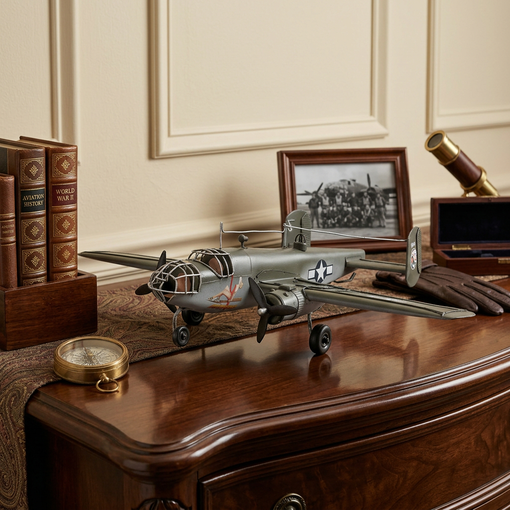 This 4-inch gray and white metal hand painted c1941 north american b-25 mitchell bomber model airplane will add a beautiful decorative accent to your decor. This charming decorative accent is expertly made of high grade metal in a gray and white coloration. This replica makes a great tabletop accent for your coffee table, desk, bookshelf, dresser or mantle. A perfect decorative addition for anyone who loves nostalgia and vintage style models and replicas. It's a perfect addition for those who love an up-to-the-minute look and feel. 4-inch h x 16.5-inch w x 12-inch d.