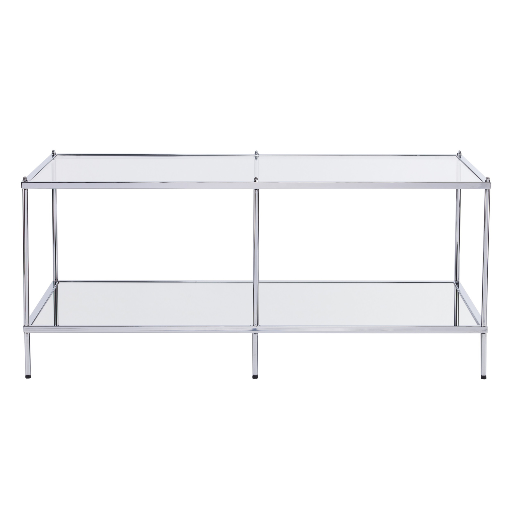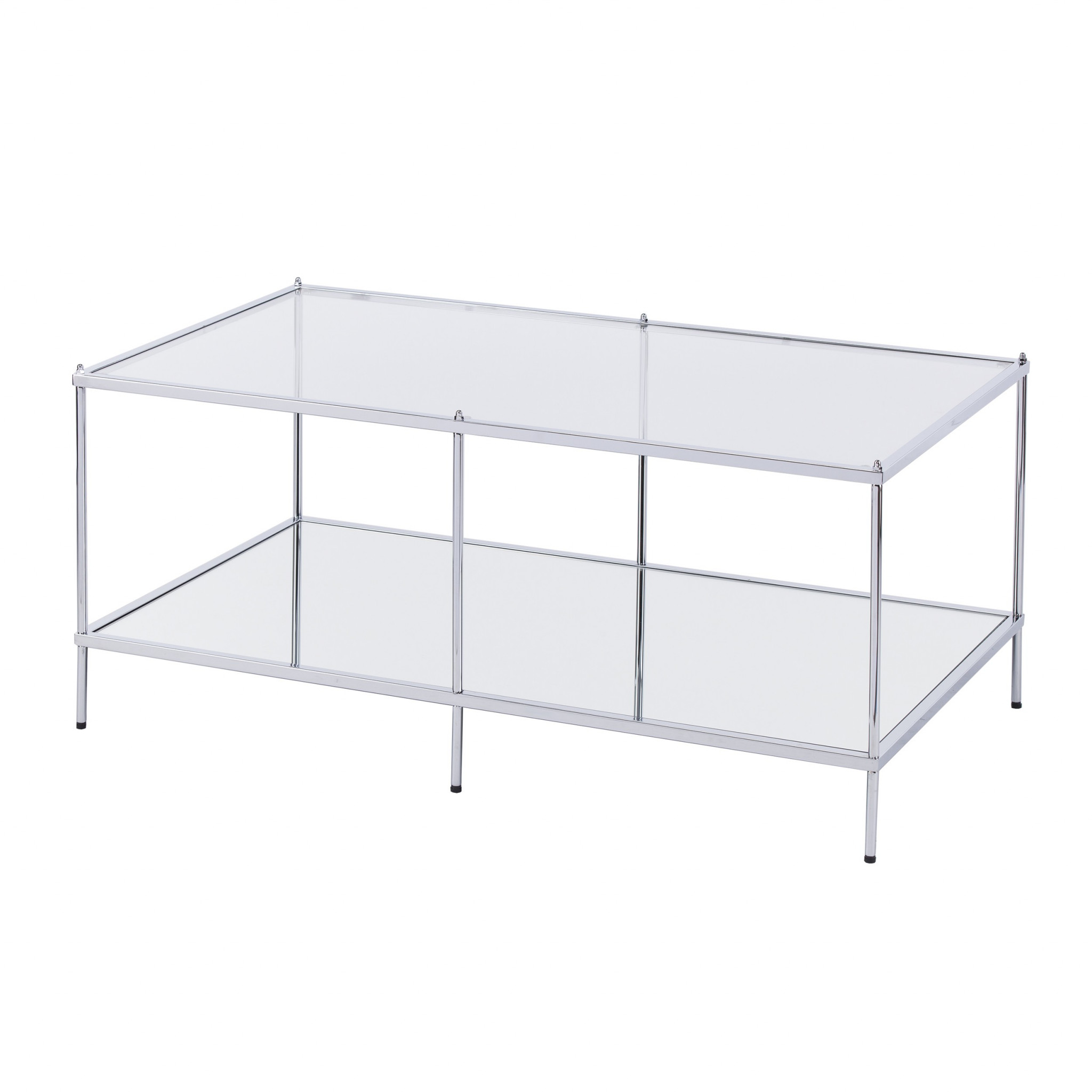 Make your living room or family room really stand out with this 42" chrome glass and metal rectangular mirrored coffee table. This multi-functional coffee table is built to last from high quality metal. The chrome coloration runs throughout this good looking metal and glass table. Reflective pieces of mirrored glass give this table a glamorous and unique look. This rectangular table is an updated take on a classic. The chrome coloration throughout gives this piece an updated and refreshing look. It has a lovely design that will definitely breathe some fresh air into your interior. This coffee table is the sturdy, reliable and stylish answer to your living room needs. 19" H x 42.25" W x 24" D