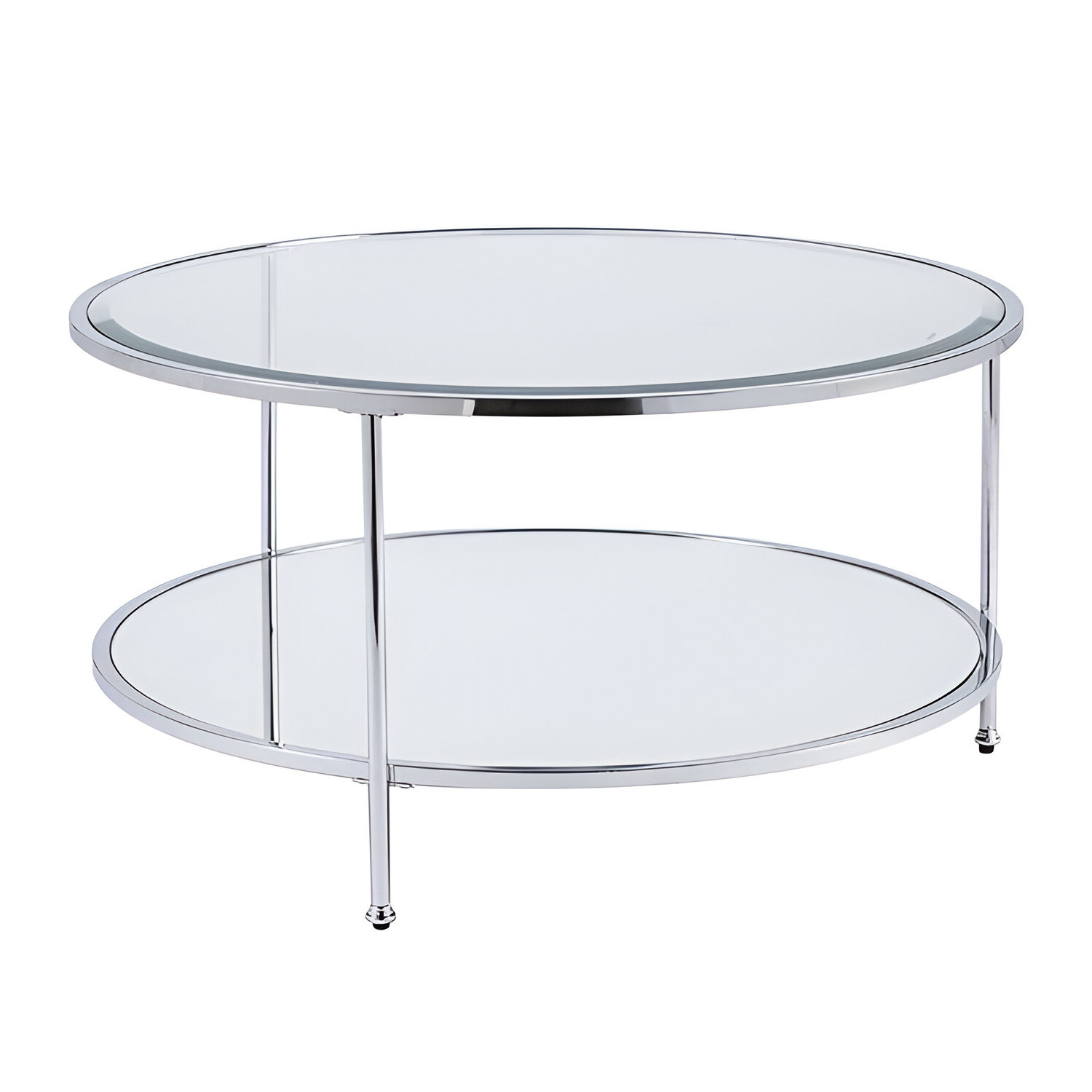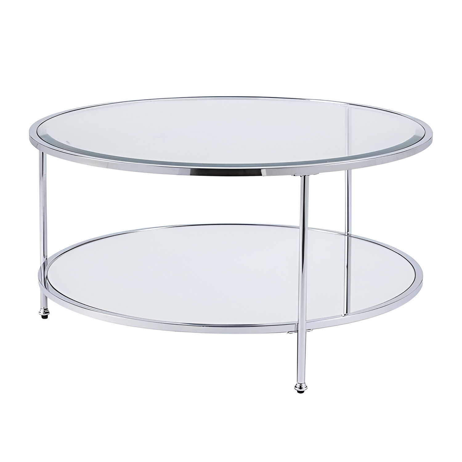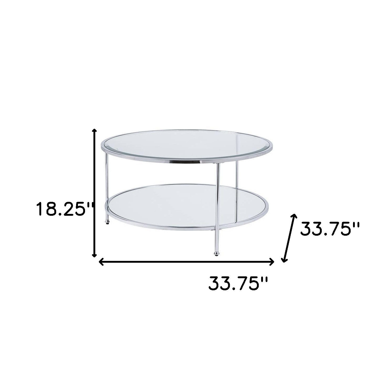 This good looking 34" chrome glass and metal round mirrored coffee table is not only practical, but good looking and built to last. This coffee table is expertly made from high quality metal. A sleek chrome monotone color gives this metal and glass table a fresh and updated look. Reflective pieces of mirrored glass give this table a glamorous and unique look. This round table features a unique shape to give your room a visually pleasing accent. This table features an updated monotone color scheme with chrome as the main color on both the top and the base. If you're looking for something that can fit both into a living area, bedroom, or office, this coffee table is for you. This coffee table is the sturdy, reliable and stylish answer to your living room needs. 18.25" H x 33.75" W x 33.75" D