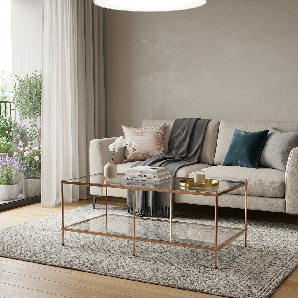 This stylish 42-inch clear and gold glass and metal coffee table is not only practical, but good looking and built to last. Quality construction from the gold metal base combines with clear glass of the top to give this table a fresh and updated look. Reflective mirrored glass on the handy and convenient bottom shelf give this table a glamorous and unique look. This classic rectangular table will be a great accent in any room it has an attractive design that will definitely breathe some fresh air into your interior. 19-inch h x 42.25-inch w x 24-inch d