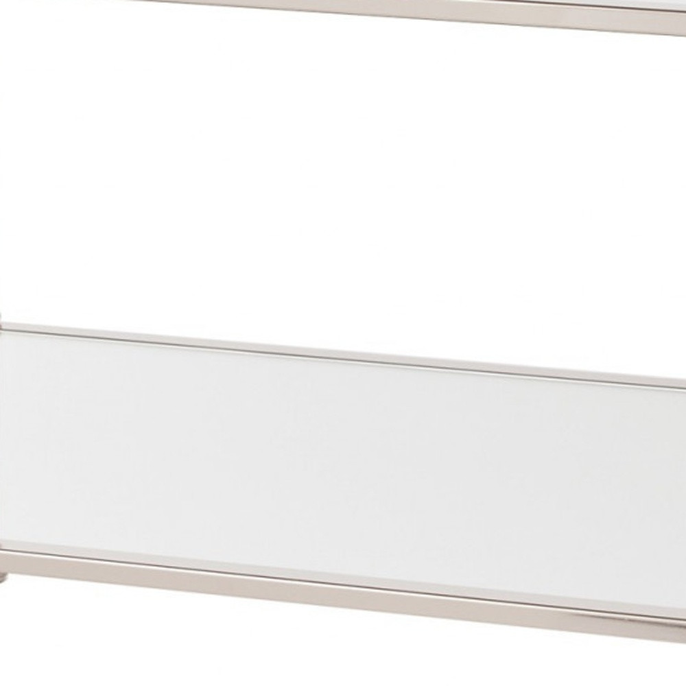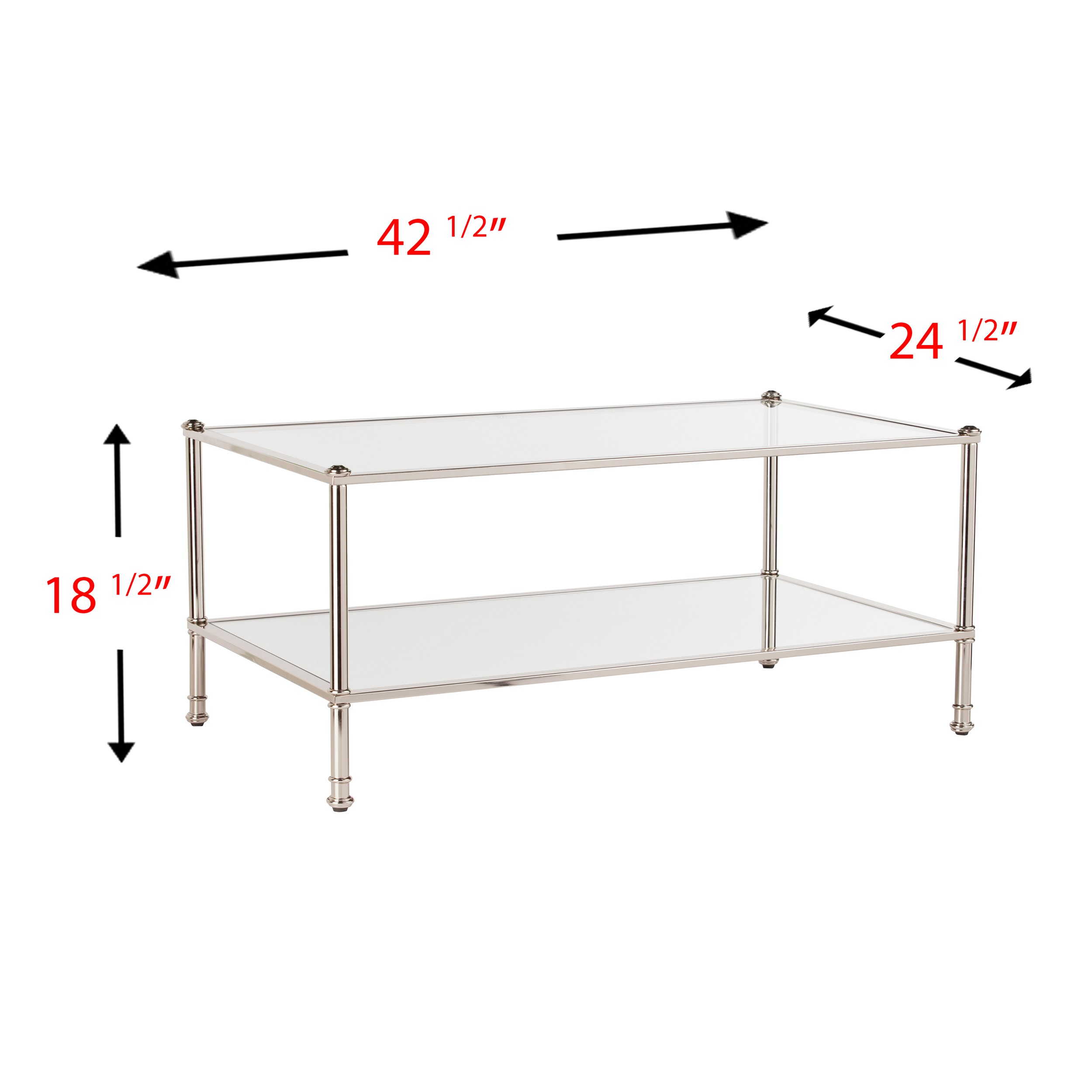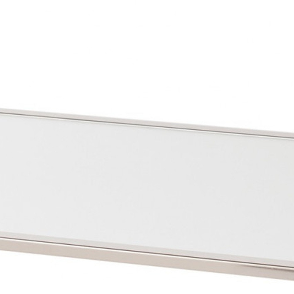 Add handsome, fashionable design to your living space with this 43" silver mirrored and metal rectangular mirrored coffee table. This coffee table is expertly made from high quality metal. The silver coloration runs throughout this good looking metal and mirrored table. Reflective pieces of mirrored glass give this table a glamorous and unique look. This rectangular table is an updated take on a classic. The silver coloration throughout gives this piece an updated and refreshing look. If you're looking for something that can fit both into a living area, bedroom, or office, this coffee table is for you. This coffee table is the sturdy, reliable and stylish answer to your living room needs. 18.5" H x 42.5" W x 24.5" D
