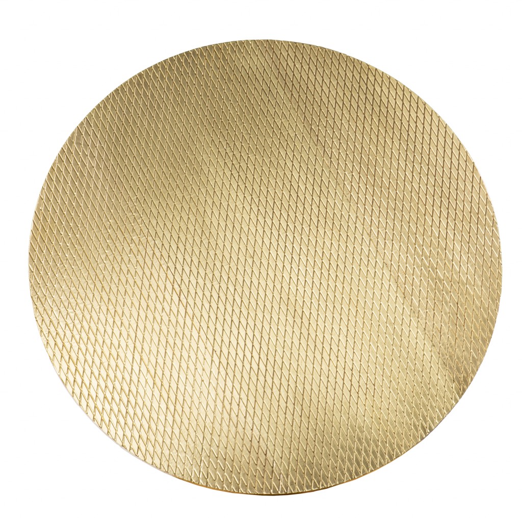Stylish and super sturdy, the 34" gold and black embossed metal round coffee table is an amazingly good looking coffee table that will compliment your living room. Sleek black tapered metal legs are paired with a bronze gold tone tabletop for a stunning contemporary look. This round cocktail table utilizes its unique shape to give your room a modern geometric accent. This chic table is handmade with a unique look that is both contemporary and slightly industrial. It has a lovely design that will definitely breathe some fresh air into your interior. 18.25" H x 34" W x 34" D