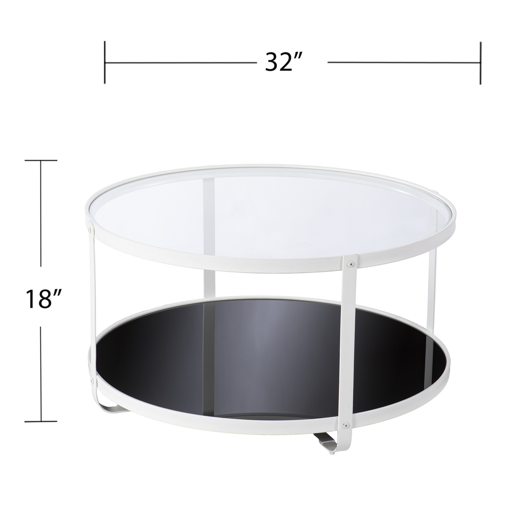 Give your living room, family room, or office the perfect anchor piece with this 32" white glass and metal round coffee table. This coffee table is expertly made from high quality metal. The white coloration runs throughout this good looking metal and glass table. This round table features a unique shape to give your room a visually pleasing accent. This table features an updated monotone color scheme with white as the main color on both the top and the base. It has a lovely design that will definitely breathe some fresh air into your interior. This coffee table is the sturdy, reliable and stylish answer to your living room needs. 18" H x 32" W x 32" D
