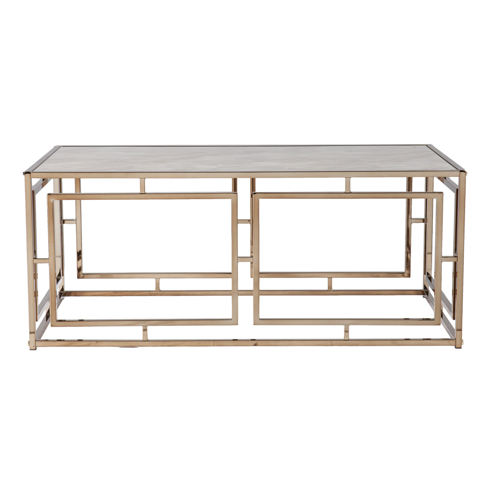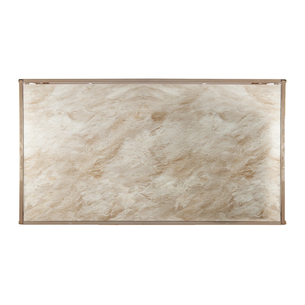 Make your living room or family room really stand out with this 44" champagne glass and metal rectangular coffee table. This coffee table is expertly made from high quality marble. A solid champagne metal frame is finished off with a matching champagne glass table, giving this table a chic monotone look. This rectangular table will be a great accent in any room This table features an updated monotone color scheme with champagne as the main color on both the top and the base. If you're looking for something that can fit both into a living area, bedroom, or office, this coffee table is for you. This coffee table is the sturdy, reliable and stylish answer to your living room needs. 18" H x 43.75" W x 24" D