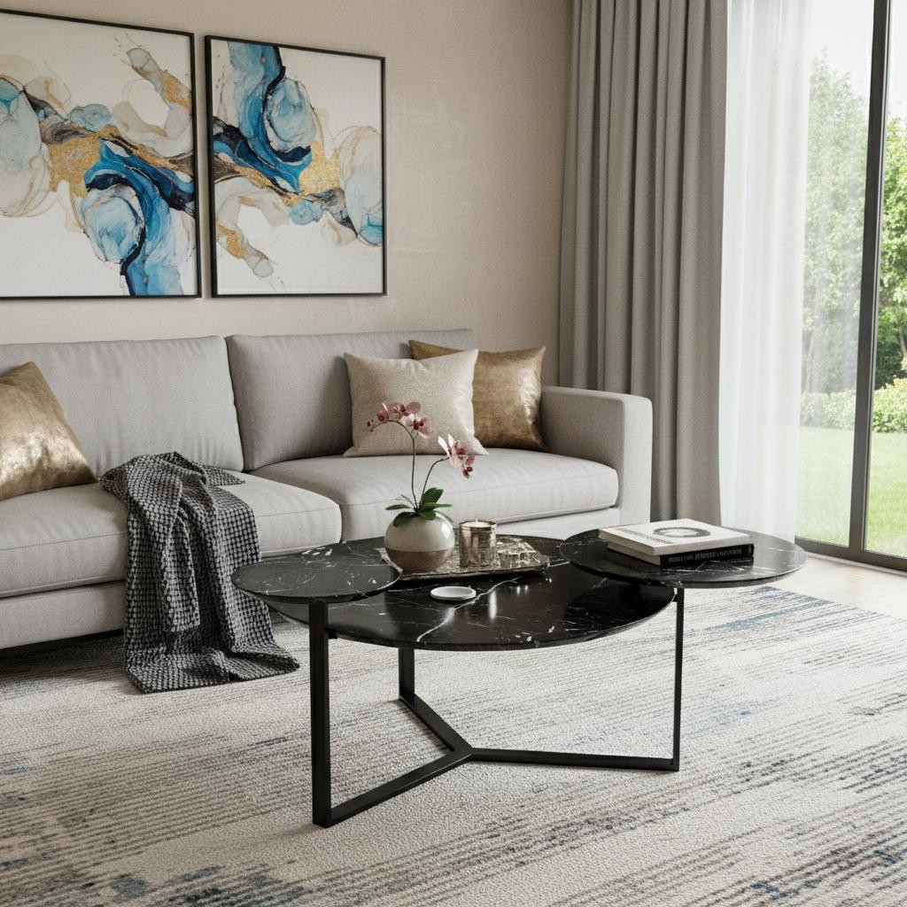 This good looking 43" black solid manufactured wood and metal free form coffee table is not only practical, but good looking and built to last. This coffee table is expertly made from high quality marble. The black coloration runs throughout this good looking metal and solid manufactured wood table. This free form table features a unique shape to give your room a visually pleasing accent. The black coloration throughout gives this piece an updated and refreshing look. It has a lovely design that will definitely breathe some fresh air into your interior. This coffee table is the sturdy, reliable and stylish answer to your living room needs. 20.25" H x 43" W x 33" D