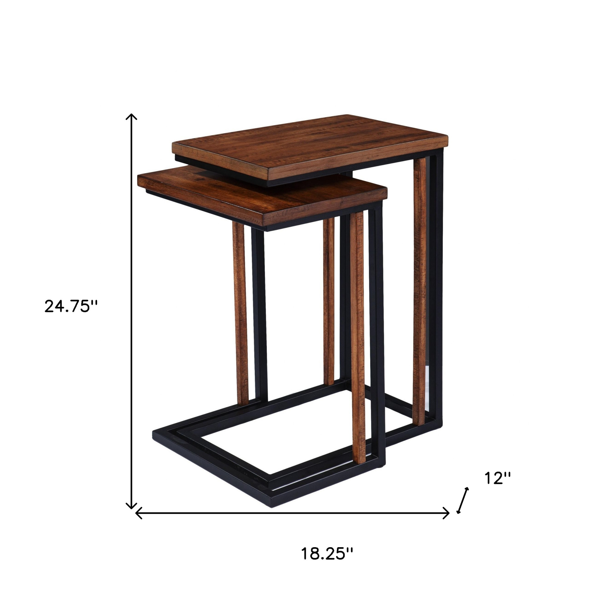 Increase your decorating options with this set of two 25" brown solid wood rectangular nested end tables that will enhance your space. This pair makes the ideal companion for flanking the sofa or bed and can be used together or separately as you choose. This table features a modern and versatile C-shape and features rustic brown tops. This modern set nests easily together when not in use. A great accent on either side of the sofa or bed, this adorable end or side table is just what you need. You can also use it as an entryway table to hold your keys. 24.75" H x 18.25" W x 12" D