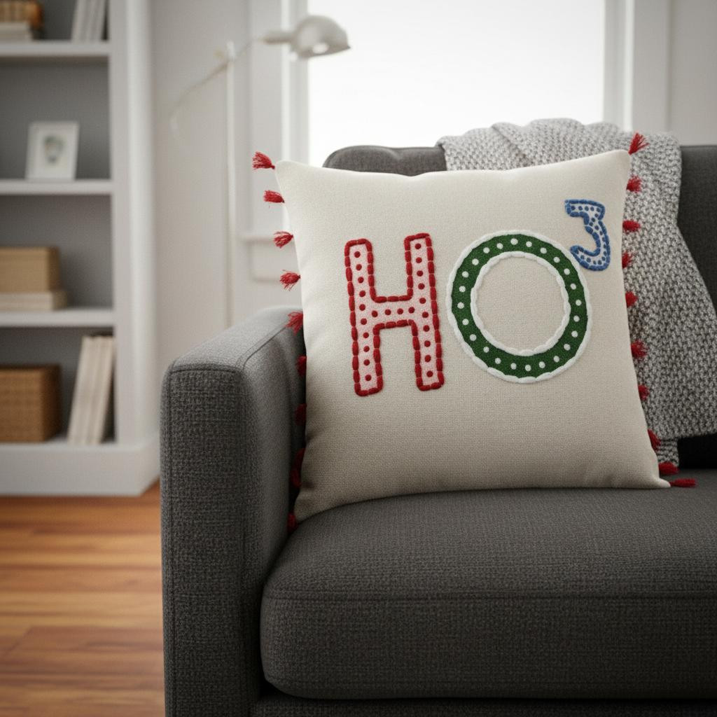 As lovely as it is humorous, this Beige Red Holiday Whimsical Throw Pillow makes every season feel like the holidays. A mixture of machine embroidered bases and hand-embroidered outlines put together Santa’s catchphrase on the center of the pillow with thin red tassels on either sides for visual interest. The pillow features a cotton fabric with a solid coordinating back and zipper closure for convenience. Filled with a plush polyester insert, the pillow exudes a fluffy and soft texture. The pillow is knife-edged to give it a refined appearance that fits any style of interior. Enjoy the holidays to the fullest with your loved ones as this whimsical throw pillow brings the family closer with its spirited appeal. 18" x 18" x 6”