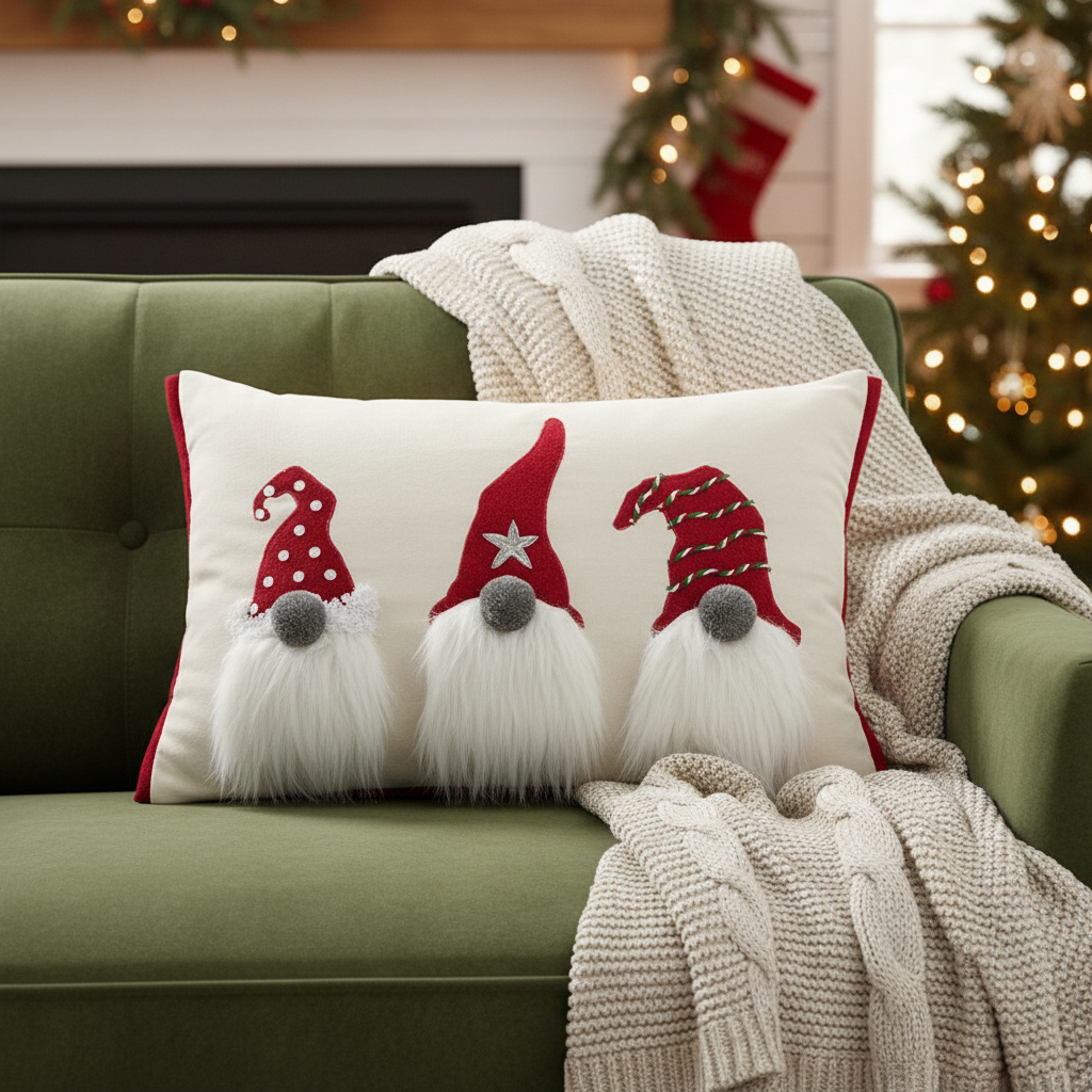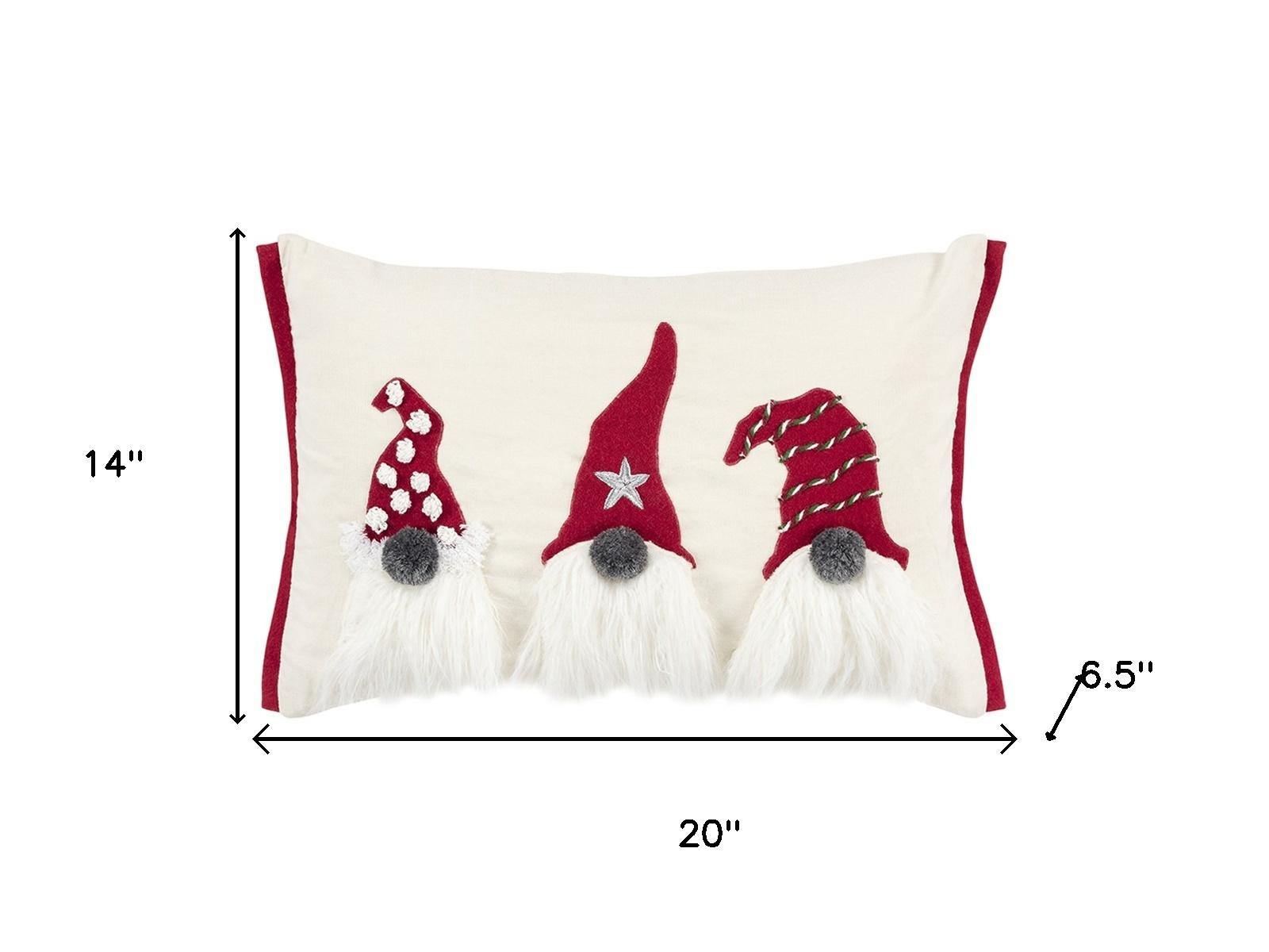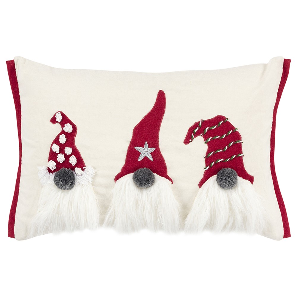 Festive without screaming Christmas, this 14-inch x 20-inch red and ivory cotton Christmas gnomes throw pillow with embroidery is a great way to celebrate and decorate for the holidays. This fun pillow represents quality construction, expertly made from durable cotton that is not only long lasting but soft to the touch as well. Featuring a trio of textural gnomes with embroidery and embellishments that will bring a smile to all. Super soft and built to hold its shape, this polyfill-filled pillow is a great option. A great way to add some festive and unique spirt to your space for the season. 14.00-inch h x 20.00-inch w x 6.50-inch d.