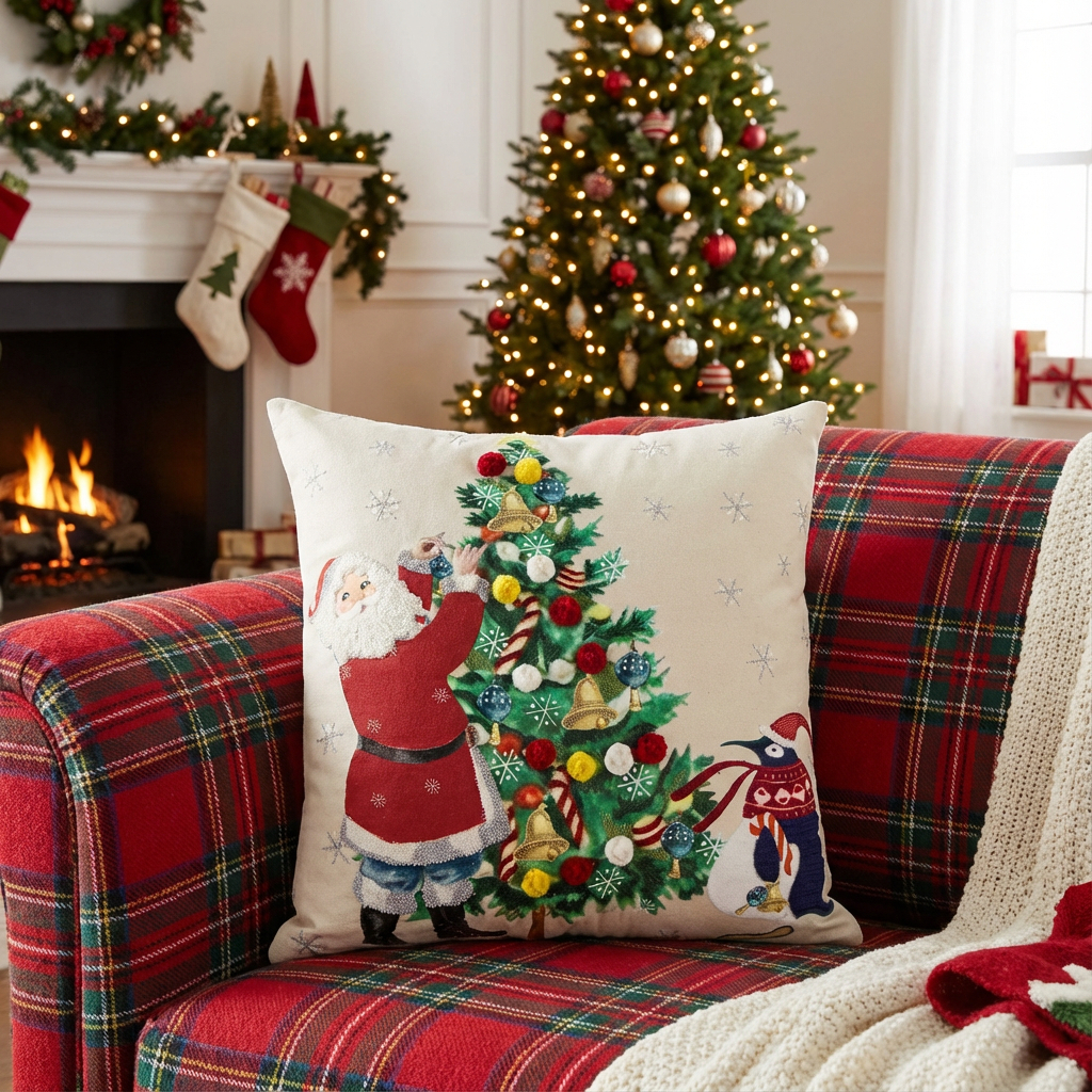 Decorate your space this holiday season in a cheery and festive way with this Ivory Vintage Santa and Penguin Christmas Throw Pillow. This nostalgic whimsical and vintage-looking Santa adorns your pillow with a variety of textures and techniques. Screen printing mixes with embroidery, faux fuzzy fur, and pom poms as Santa and his buddy the penguin help to decorate the tree. Silver embroidery adds to the printed snowflakes to give the background some sparkle. on each of the corners to give this accent a dimensional and visual pop. Generously sized, this 14" x 26" decorative accent pillow features a solid back with a hidden zipper closure for convenience.