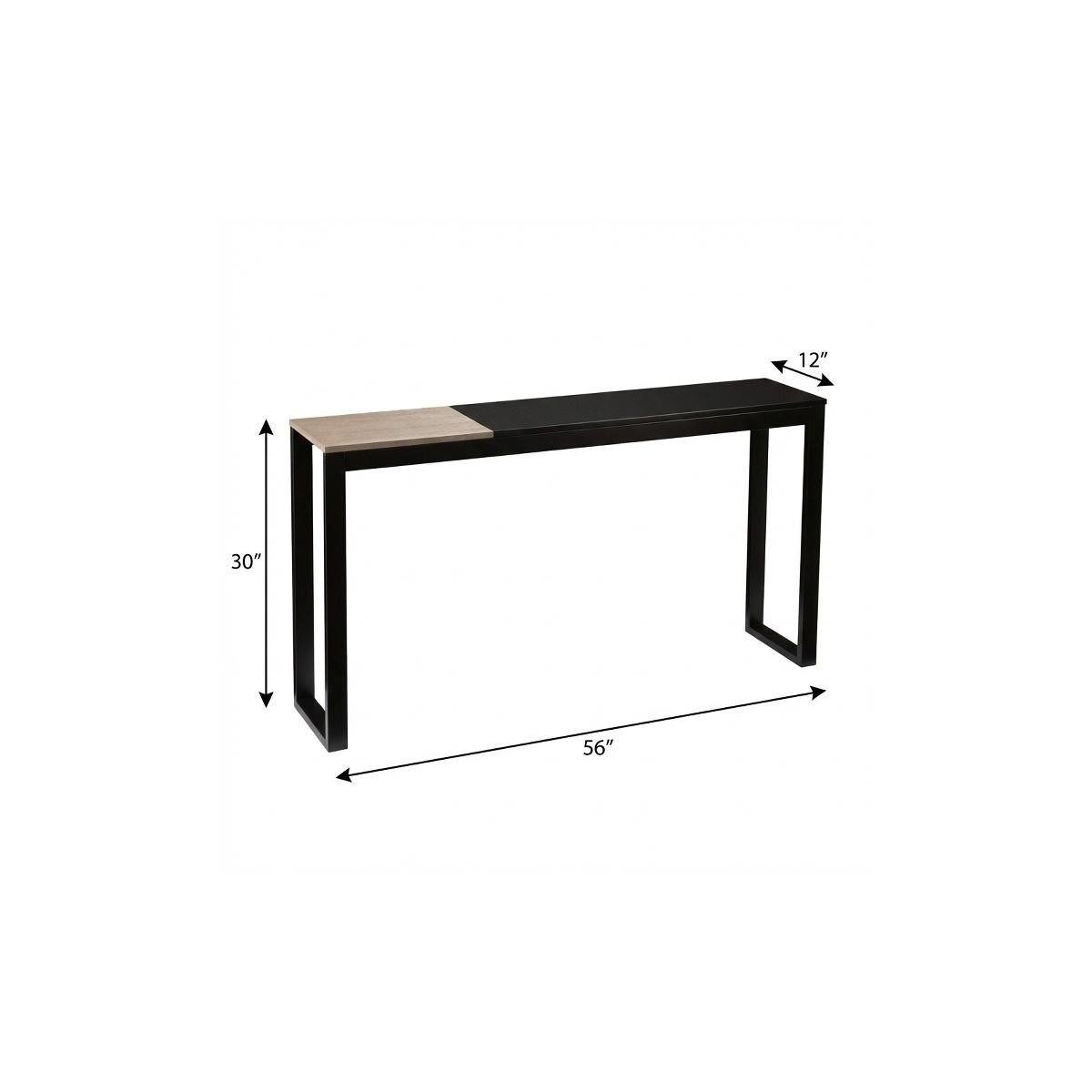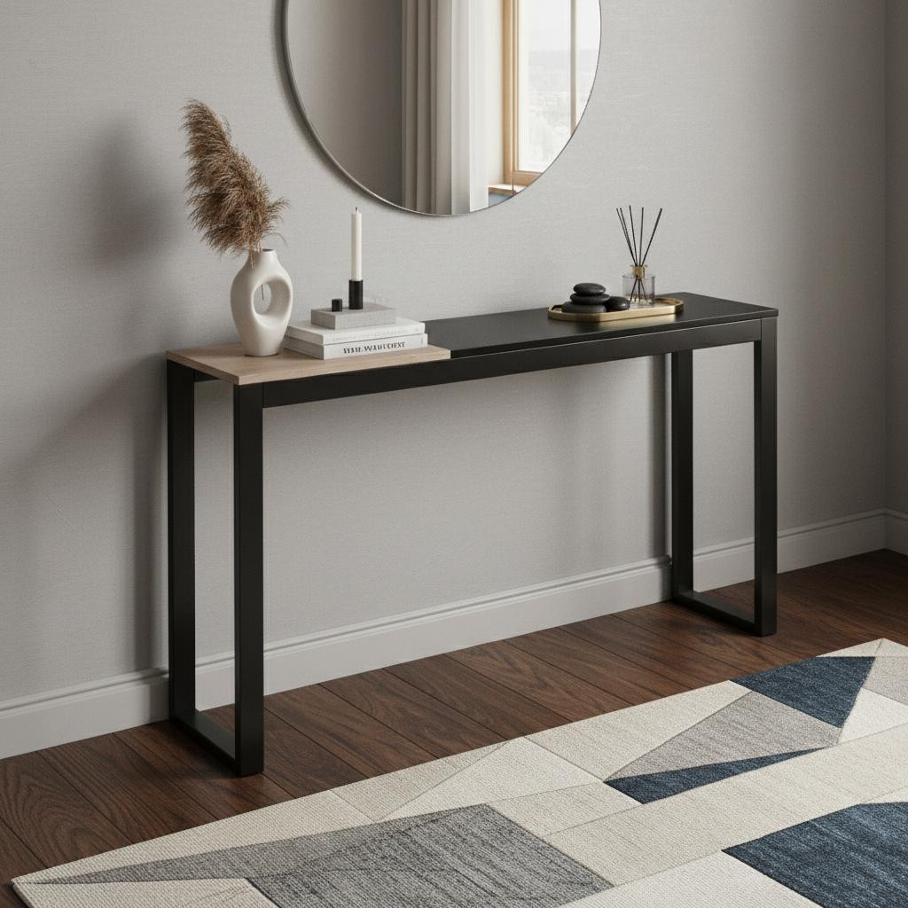 Our 56-inch natural and black and black sled console table a great addition to any room, serving as a stylish and decorative element. This versatile table is a classic rectangular shape, which will easily fit into most any space in your home. This table has a top made with natural and black manufactured wood that is known for durability and easy maintenance. Ideal for living rooms, bedrooms, home offices, and lounge areas, this console table is not only good looking but multi-functional and practical addition to your space. 30-inch H x 56-inch W x 12-inch D