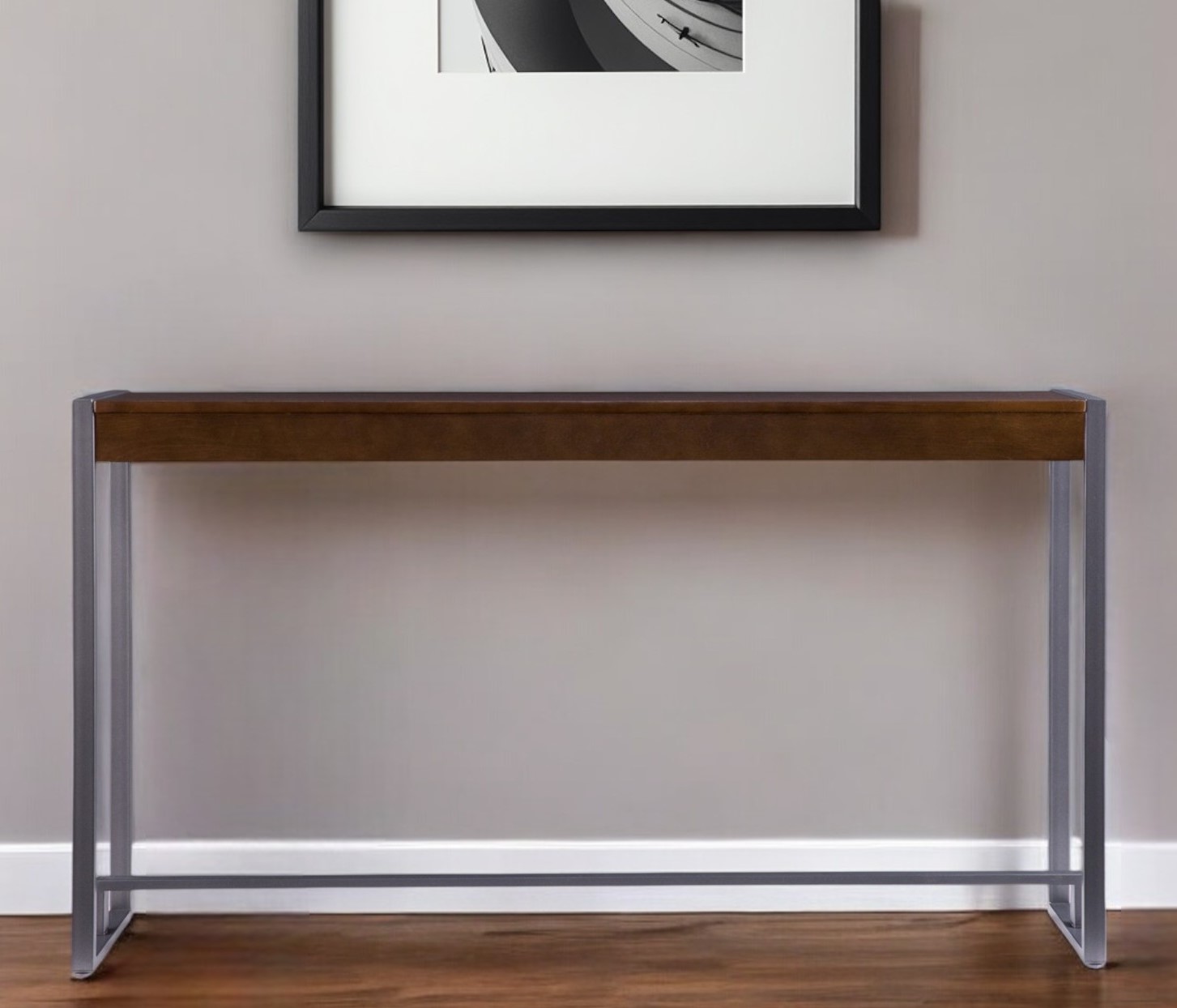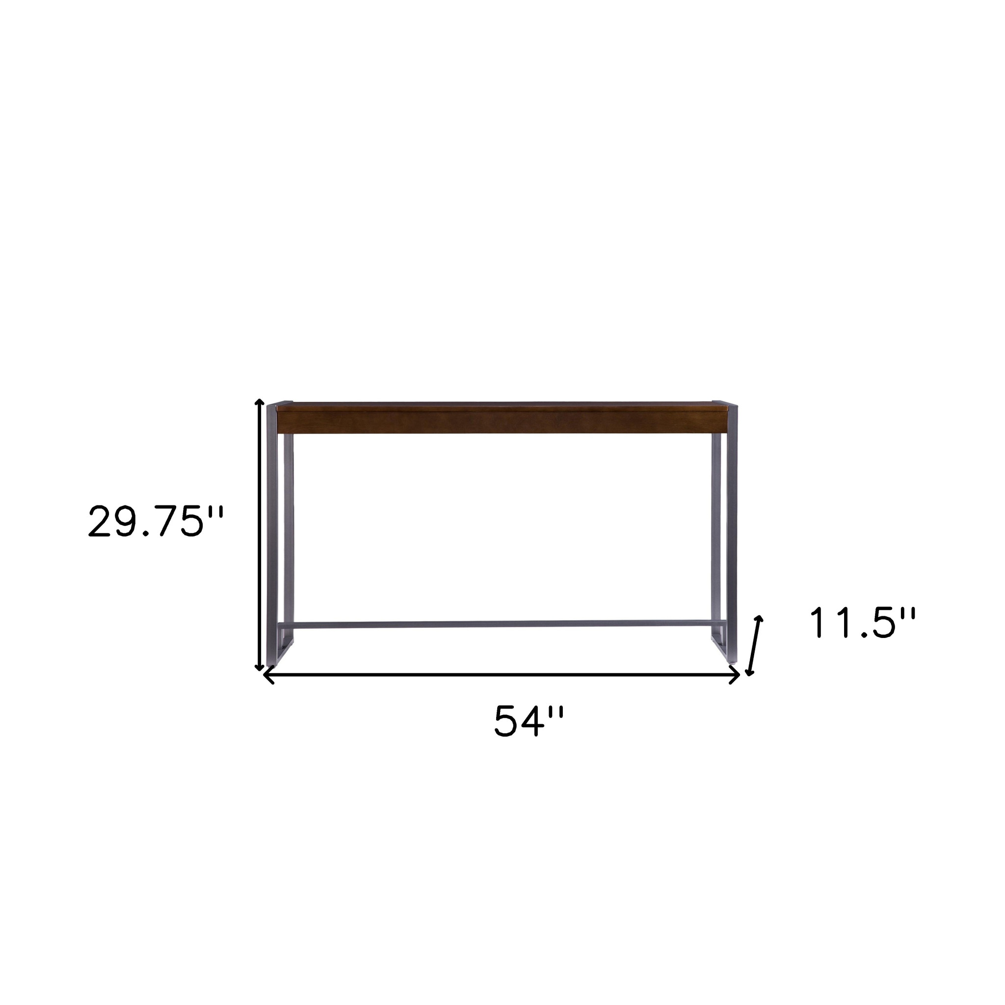 This 54-inch dark brown and gunmetal sled console table is a high-quality, long-lasting piece of furniture that you can enjoy for years to come. This versatile table is a classic rectangular shape, which will easily fit into most any space in your home. This table has a top made with dark brown manufactured wood that is known for durability and easy maintenance. Versatile in use, console tables can be used for a variety of purposes in a variety of rooms and settings. 29.75-inch H x 54-inch W x 11.5-inch D
