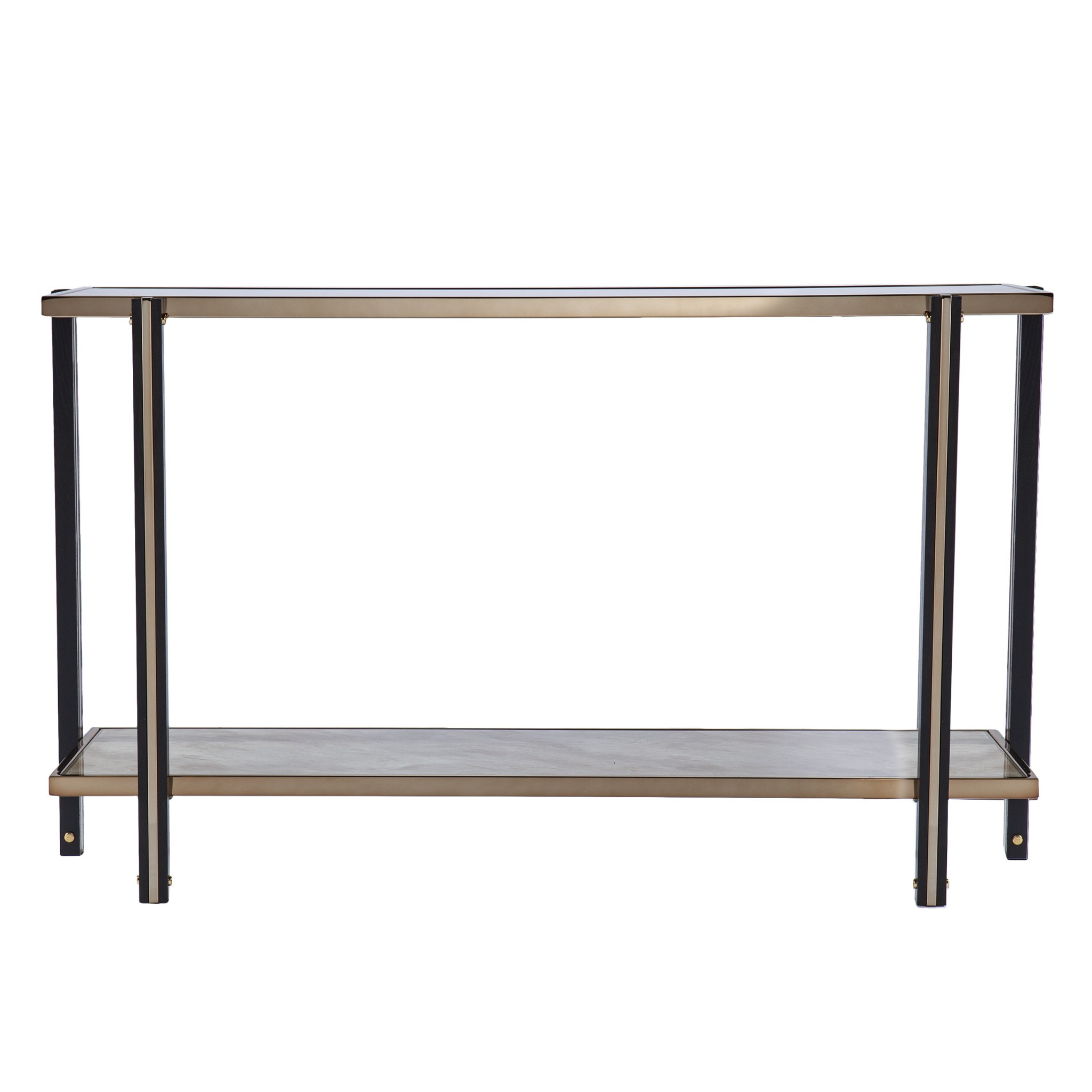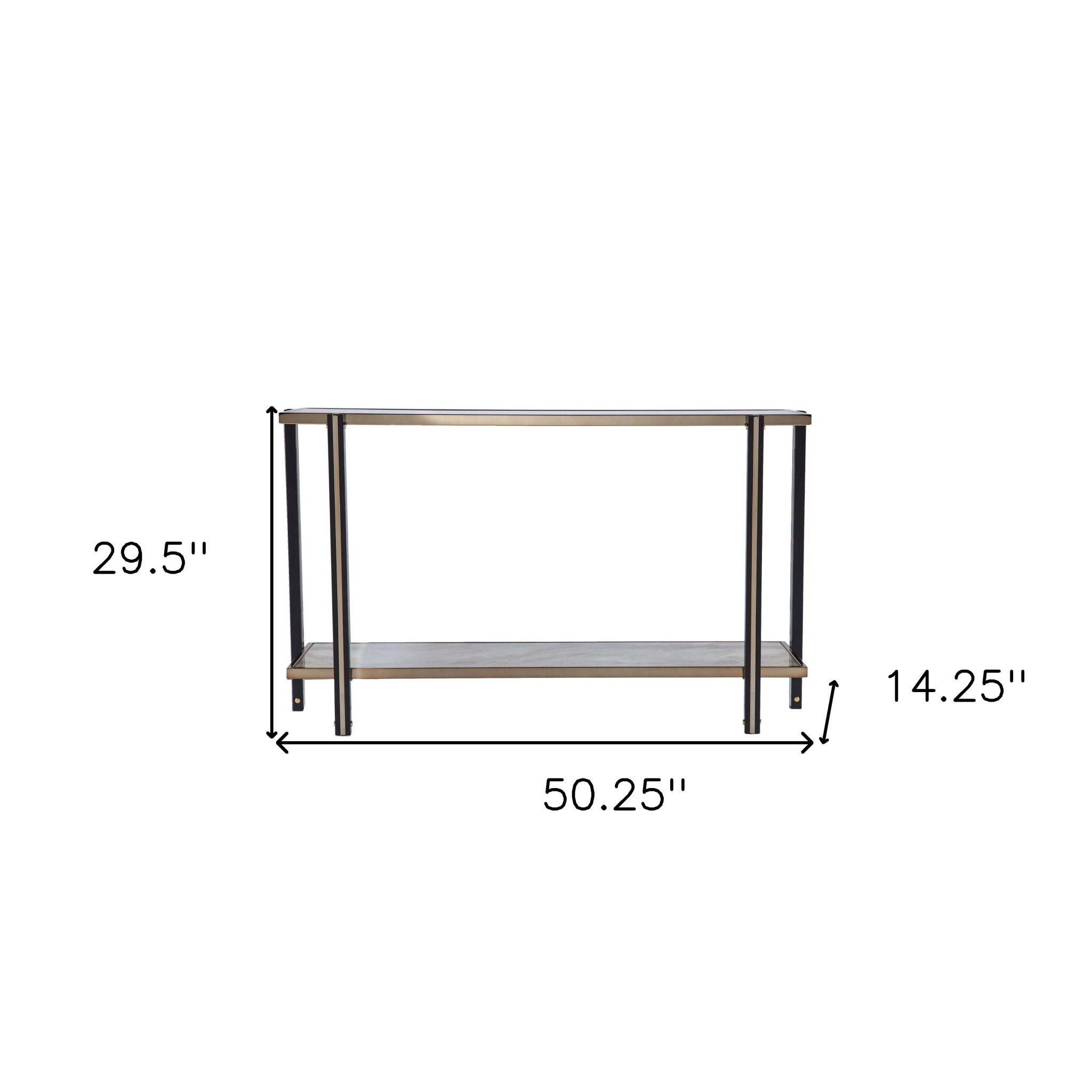 This 50-inch smoky black and champagne mirrored glass console table with shelf is a high-quality, long-lasting piece of furniture that you can enjoy for years to come. This versatile table is a classic rectangular shape, which will easily fit into most any space in your home. The smoky black glass top of this console table is a stunning and timeless choice that can transform any room into a visually captivating showcase. The four leg is made of durable, solid metal. Ideal for living rooms, bedrooms, home offices, and lounge areas, this console table is not only good looking but multi-functional and practical addition to your space. 29.5-inch h x 50.25-inch w x 14.25-inch d.