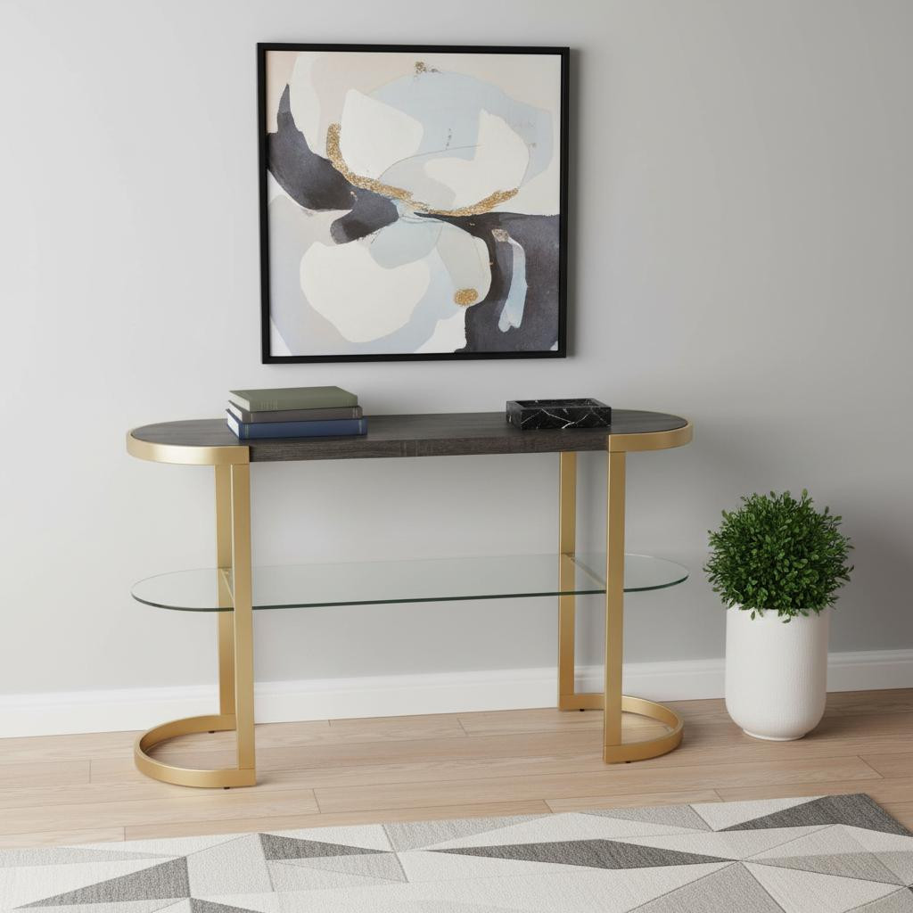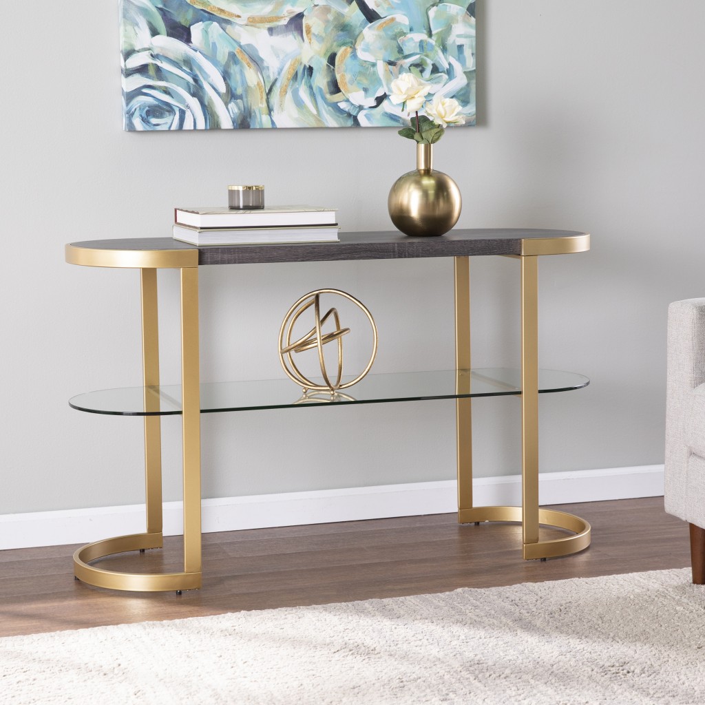 Our 49-inch gray and gold solid wood oval sled console table with storage a great addition to any room, serving as a stylish and decorative element. With this oval table, you can get the length of a rectangular table without the harsh corners and you get a little more floor space back. If you are searching for the highest quality gray wood furniture, hardwood can not be beaten as an unmatchable combination of beauty, craftsmanship, and durability. Ideal for living rooms, bedrooms, home offices, and lounge areas, this console table is not only good looking but multi-functional and practical addition to your space. 29.75-inch H x 49-inch W x 16.5-inch D