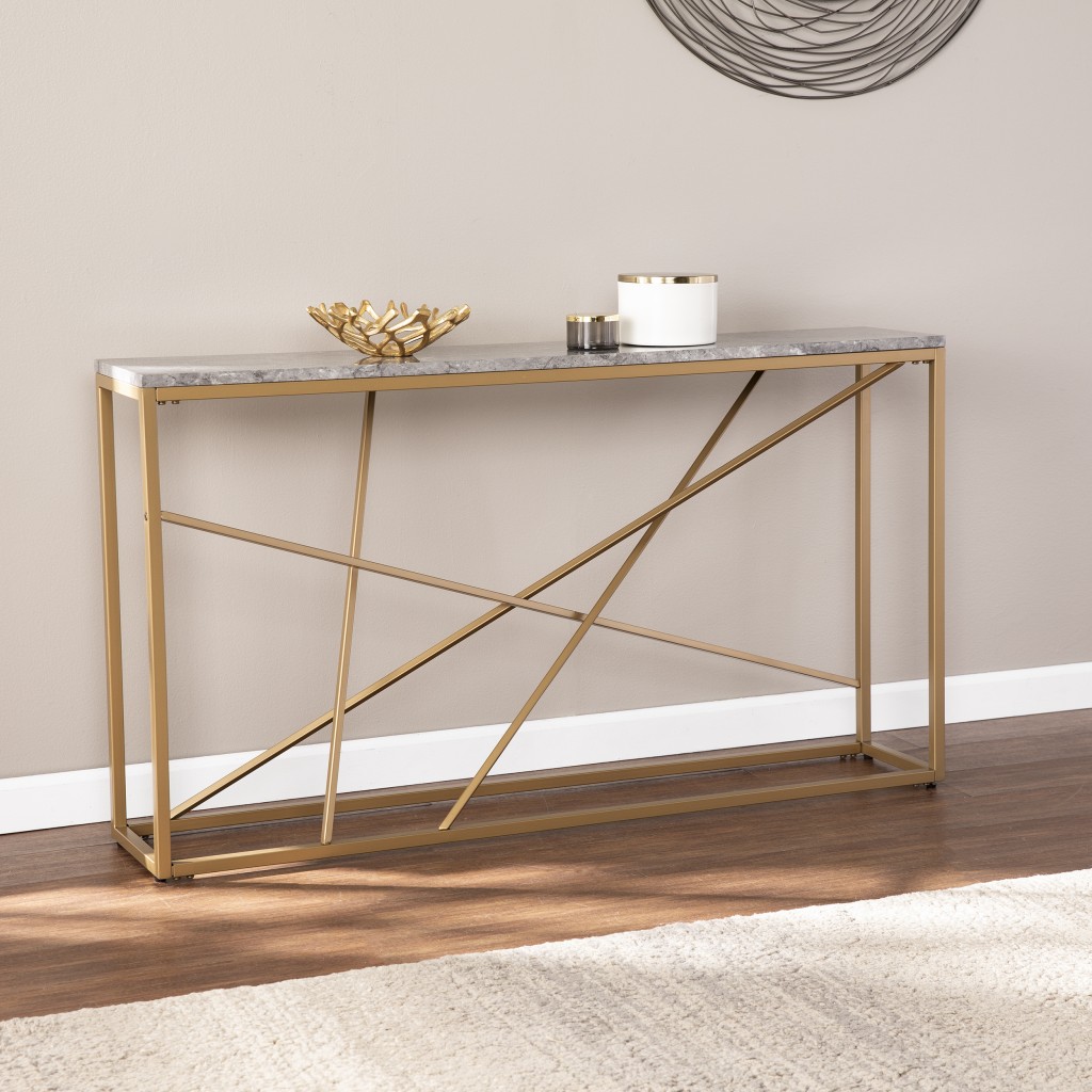 This 52-inch gray and gold faux marble frame console table can provide a variety of practical functions such as providing extra storage space, serving as a display area for decorative items or acting as a catch-all for keys, mail, and other small items. This versatile table is a classic rectangular shape, which will easily fit into most any space in your home. The gray faux marble of this table will add beauty to any room with its alluring and appealing stone like appearance. Ideal for living rooms, bedrooms, home offices, and lounge areas, this console table is not only good looking but multi-functional and practical addition to your space. 29-inch H x 52-inch W x 10-inch D