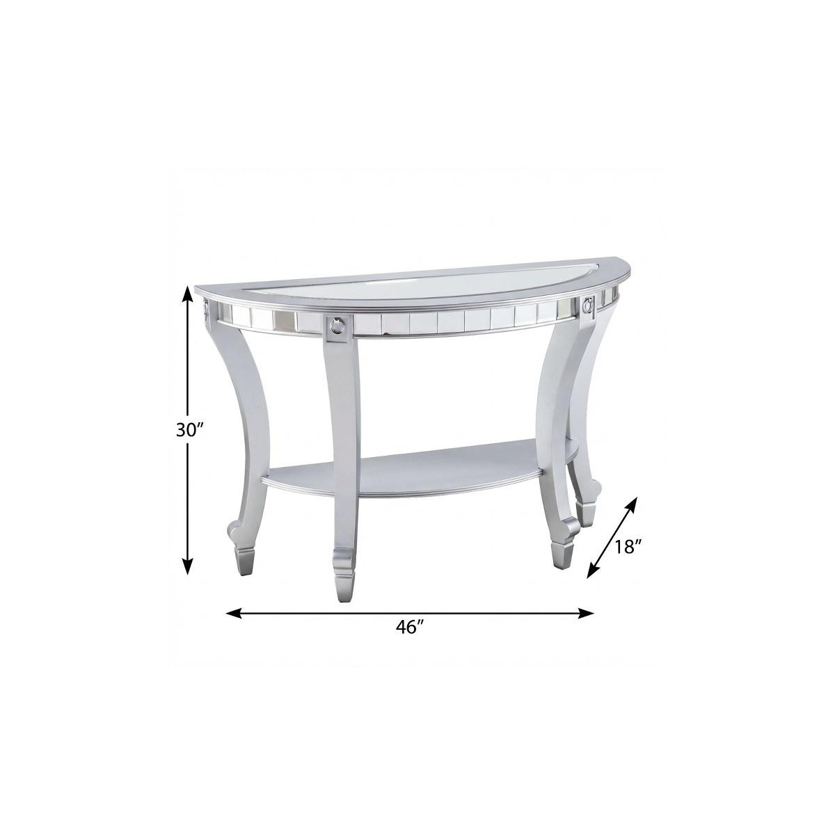 half circle console table storage, glass half circle console table, mirrored glass half circle console, 46" silver mirrored glass, silver mirrored glass half circle |