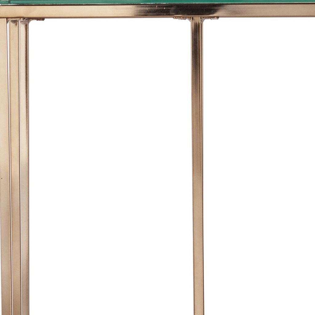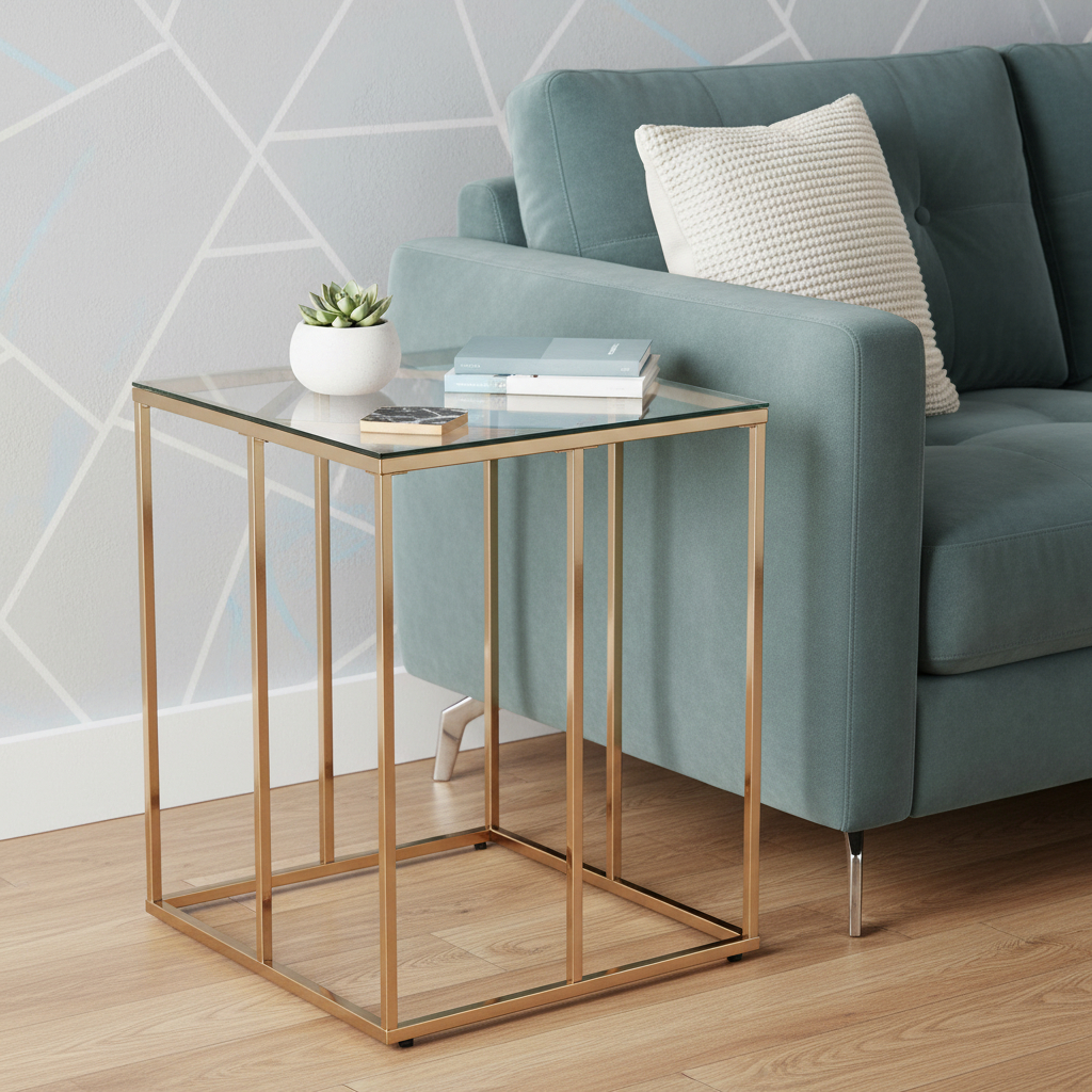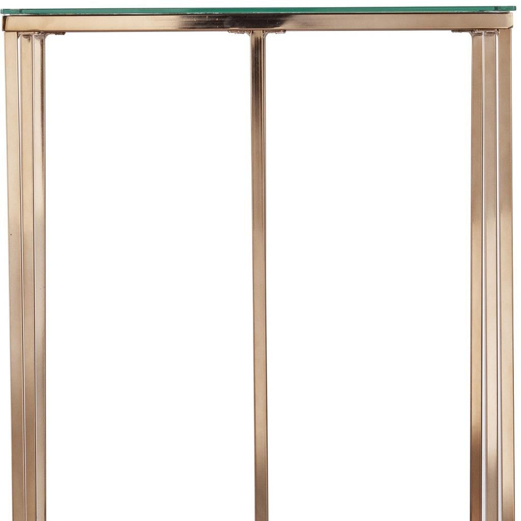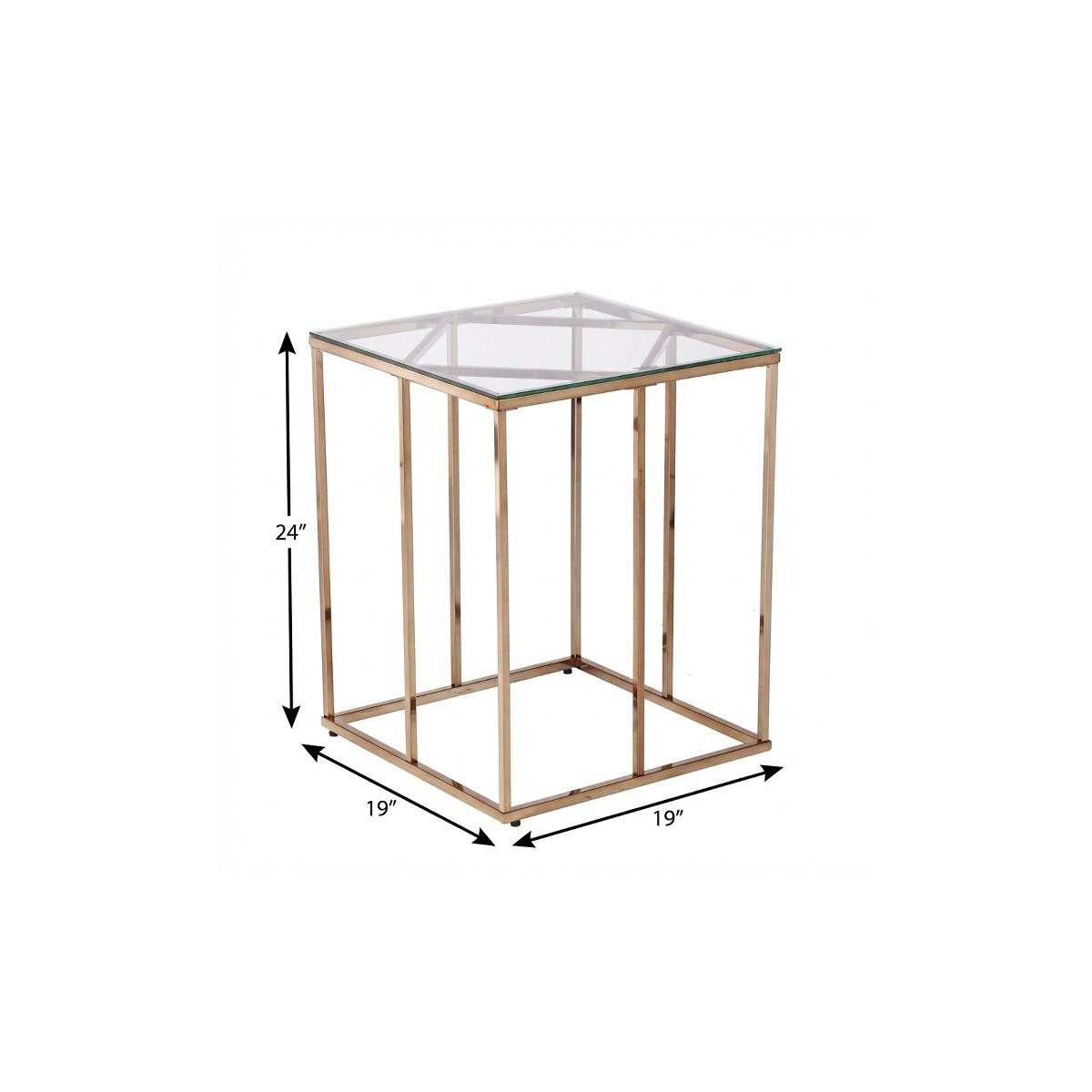 Optimize your space and add some charm to your room with the 24" champagne glass and iron square end table. This marvelous end or side table is made from high quality metal. A sleek champagne monotone color gives this iron and glass table a fresh and updated look. An ideal location for placing your snacks and drinks, and a place to keep your lamp, frames, or other accessories. This versatile table is a great accent for almost any room. 24" H x 19" W x 19" D