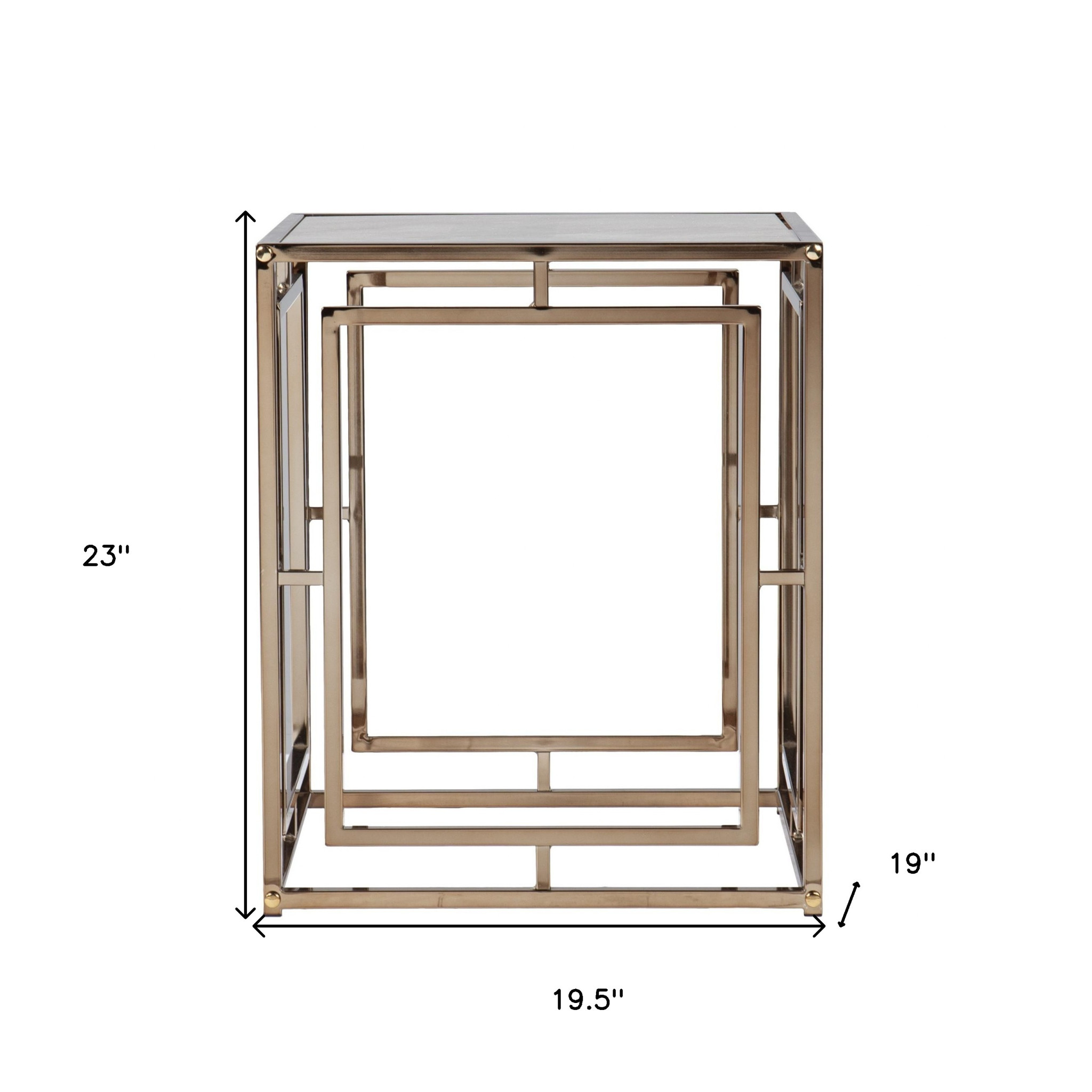Distinctive in style, the 23" champagne glass and iron square end table radiates a versatile charm. Artfully crafted of metal, this beautiful design is chock-full of fine details. A sleek champagne monotone color gives this iron and glass table a fresh and updated look. Side tables are a great way to flank your sofa, use as an accent next to your favorite chair, or can even be used bedside. This versatile table is a great accent for almost any room. 23" H x 19.5" W x 19" D