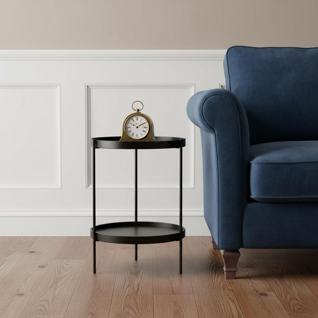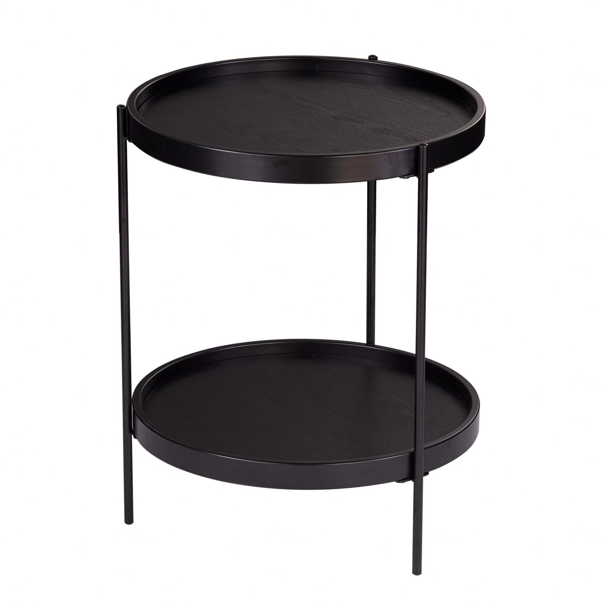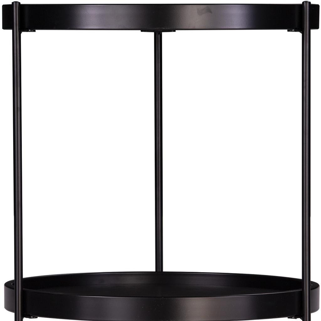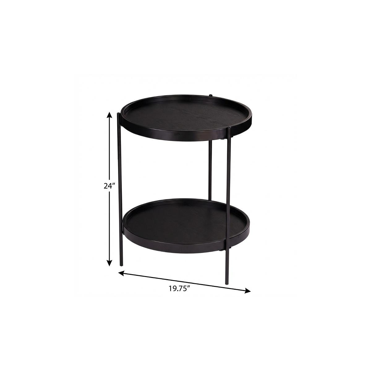 Optimize your space and add some charm to your room with the 24" black manufactured wood and iron round end table with shelf. Artfully crafted of metal, this beautiful design is chock-full of fine details. A sleek black monotone color gives this iron and manufactured wood table a fresh and updated look. Help to keep your space organized with the included single shelf. A great accent on either side of the sofa or bed, this adorable end or side table is just what you need. You can match it with other pieces to get the ideal look for your place. 24" H x 19.75" W x 19.25" D