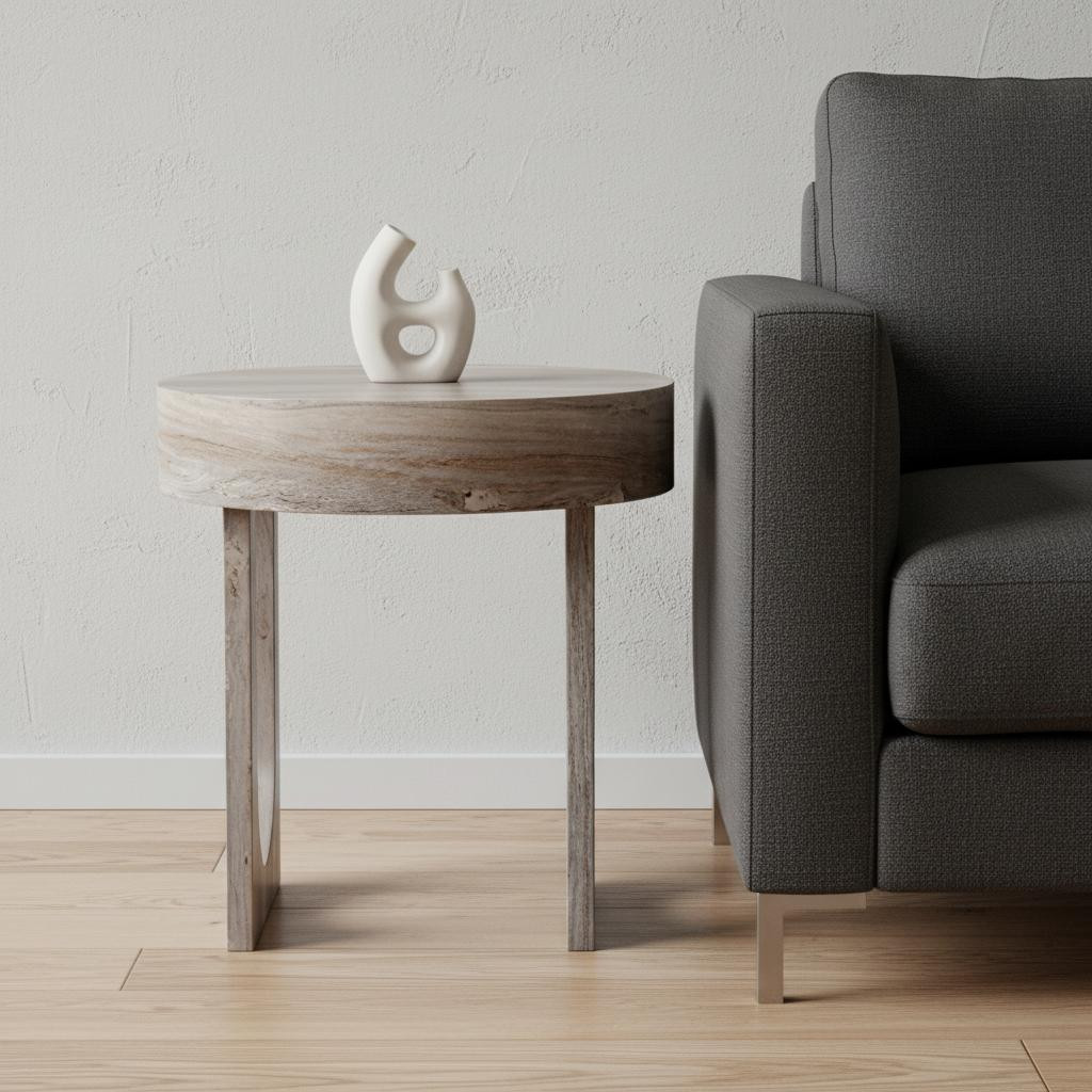 Show off your exquisite taste with this 20" brown manufactured wood round end table. Artfully crafted of manufactured wood, this beautiful design is chock-full of fine details. This table is made from manufactured wood in a brown color throughout the base and top. Side tables are a great way to flank your sofa, use as an accent next to your favorite chair, or can even be used bedside. This versatile table is a great accent for almost any room. 19.75" H x 19.75" W x 19.75" D