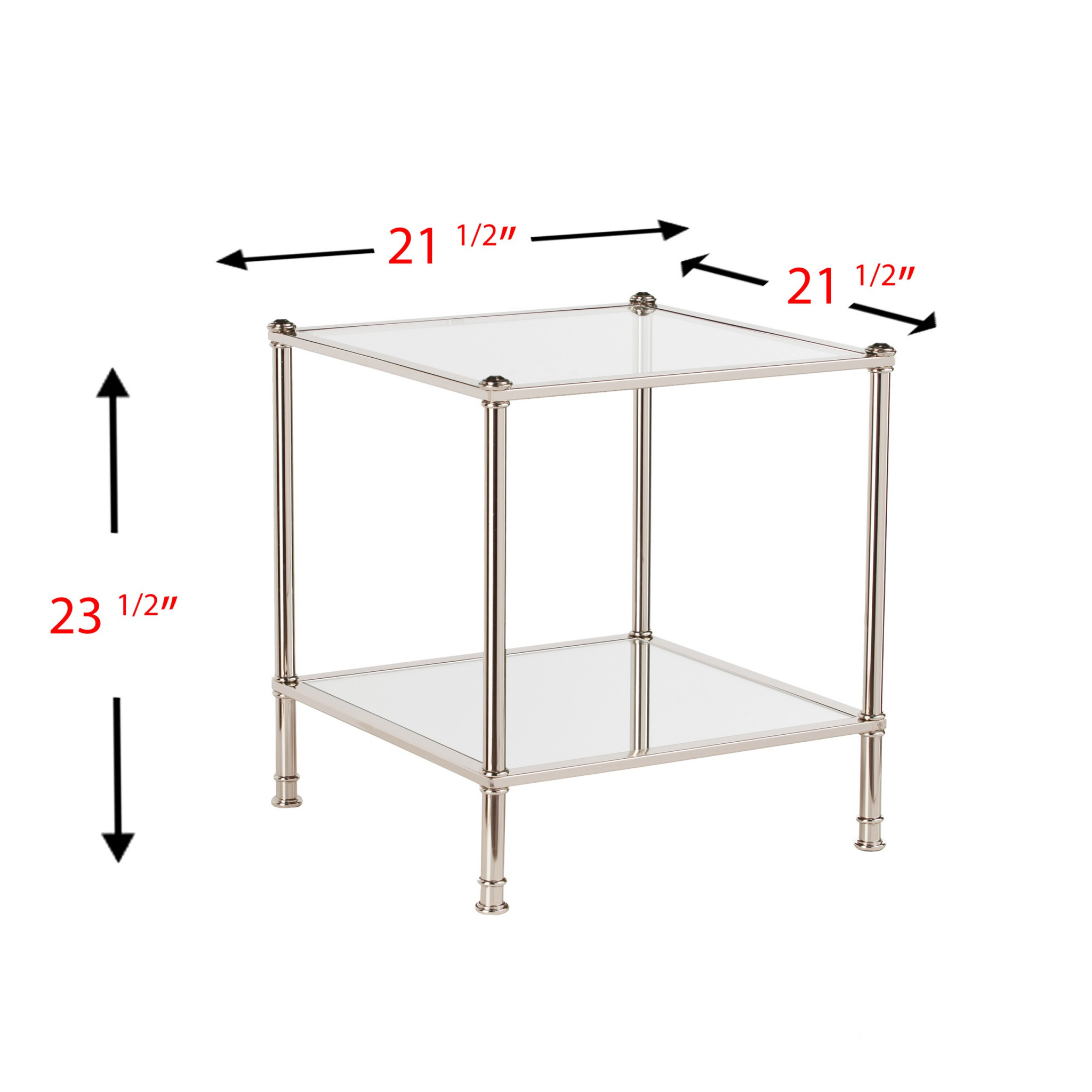 Show off your exquisite taste with this 24" silver glass and iron square mirrored end table. This marvelous end or side table is made from high quality metal. The silver coloration runs throughout this good-looking iron and glass table. Reflective pieces of mirrored glass give this table a glamorous and unique look. Side tables are a great way to flank your sofa, use as an accent next to your favorite chair, or can even be used bedside. You can match it with other pieces to get the ideal look for your place. 23.5" H x 21.5" W x 21.5" D
