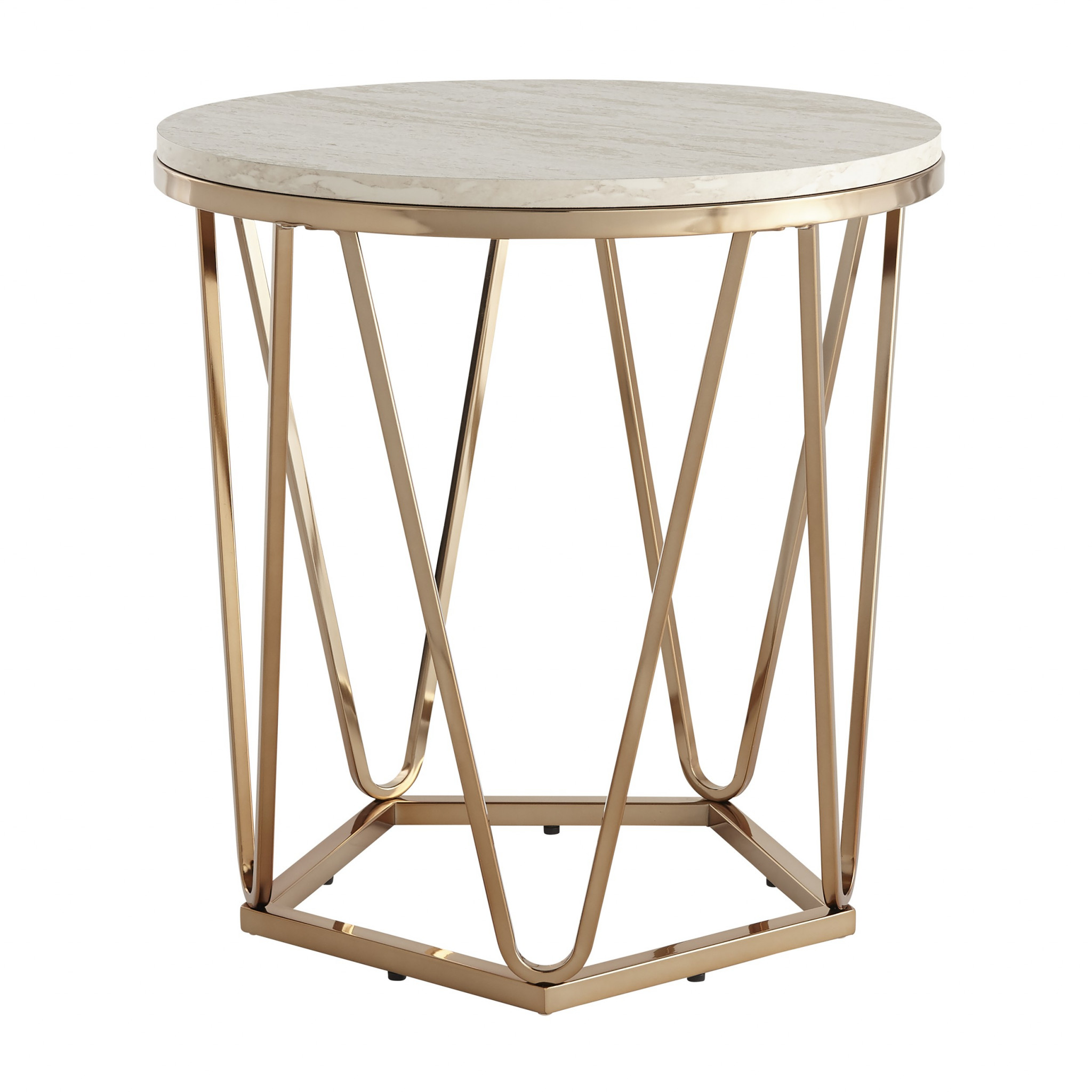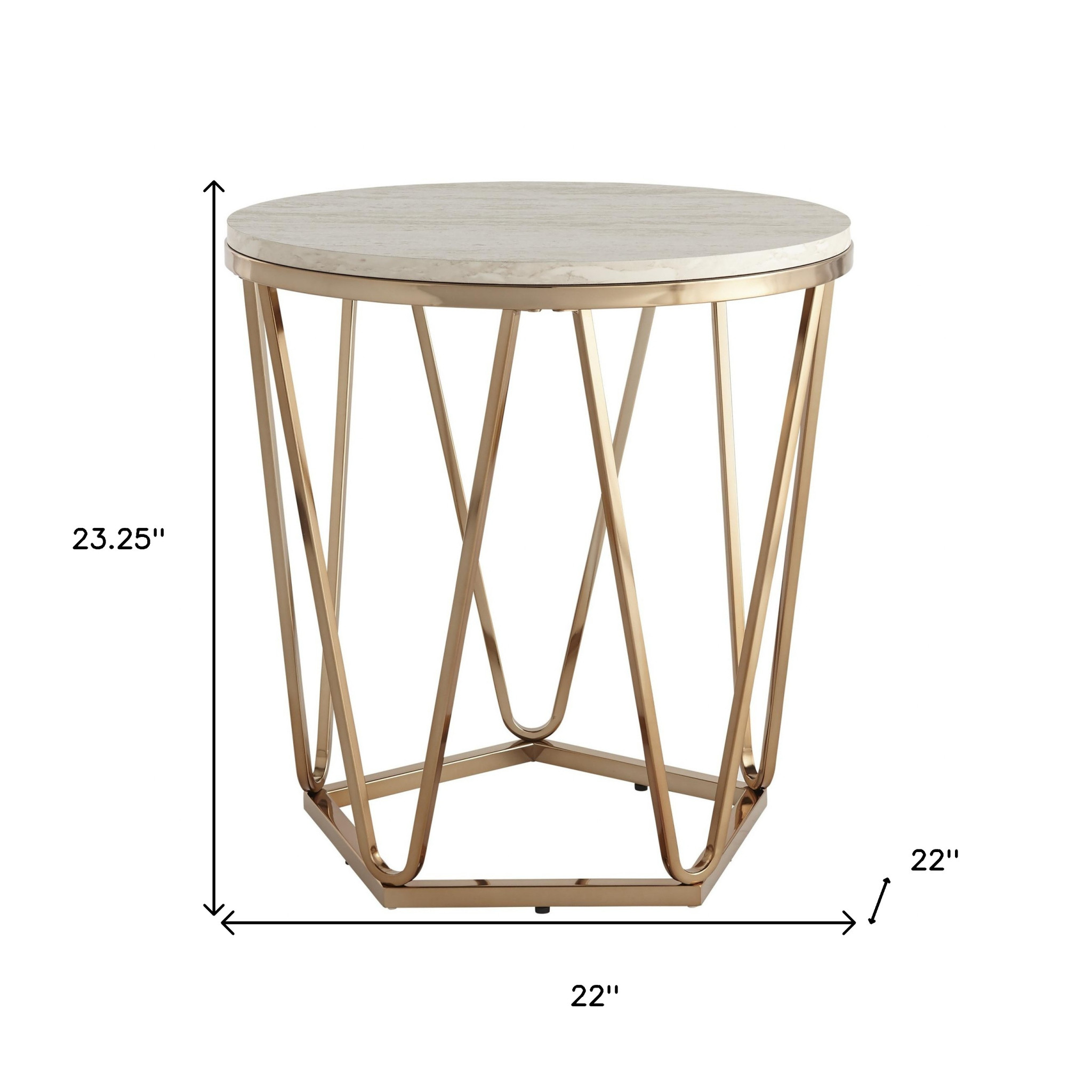 Distinctive in style the 23" champagne manufactured wood and iron round end table radiates a versatile charm. It is crafted out of metal to create an inspiring atmosphere in any room. A solid champagne iron frame is finished off with a matching champagne manufactured wood table, giving this table a chic monotone look. Side tables are a great way to flank your sofa, use as an accent next to your favorite chair, or can even be used bedside. You can match it with other pieces to get the ideal look for your place. 23.25" H x 22" W x 22" D