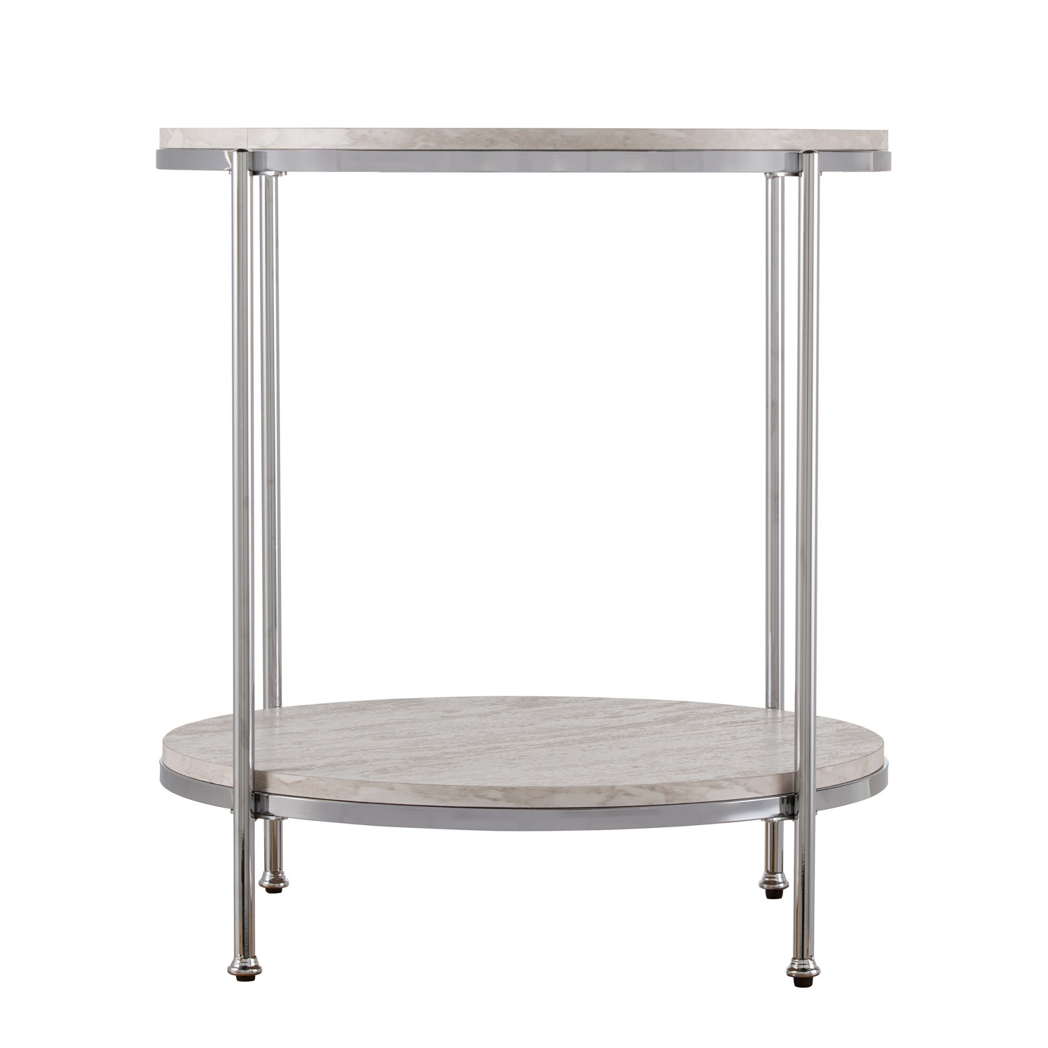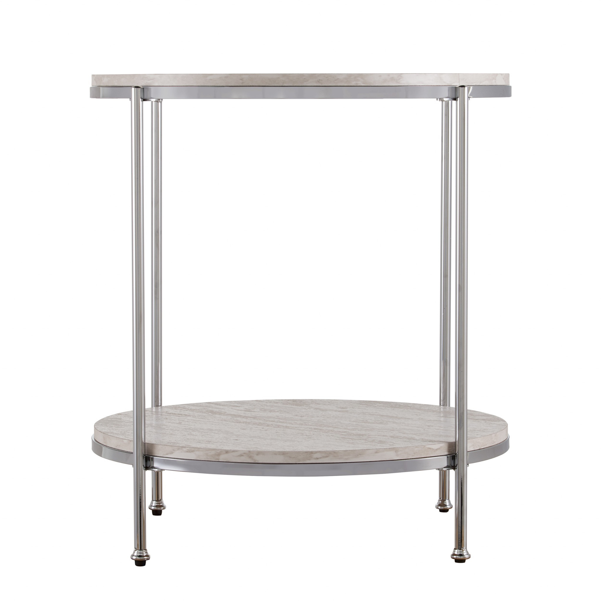 Show off your exquisite taste with this 24" chrome manufactured wood and iron rectangular end table with shelf. Artfully crafted of metal, this beautiful design is chock-full of fine details. A solid chrome iron frame is finished off with a matching chrome manufactured wood table, giving this table a chic monotone look. Includes a single shelf for handy storage or display space. Side tables are a great way to flank your sofa, use as an accent next to your favorite chair, or can even be used bedside. This versatile table is a great accent for almost any room. 24.25" H x 23.25" W x 23.25" D