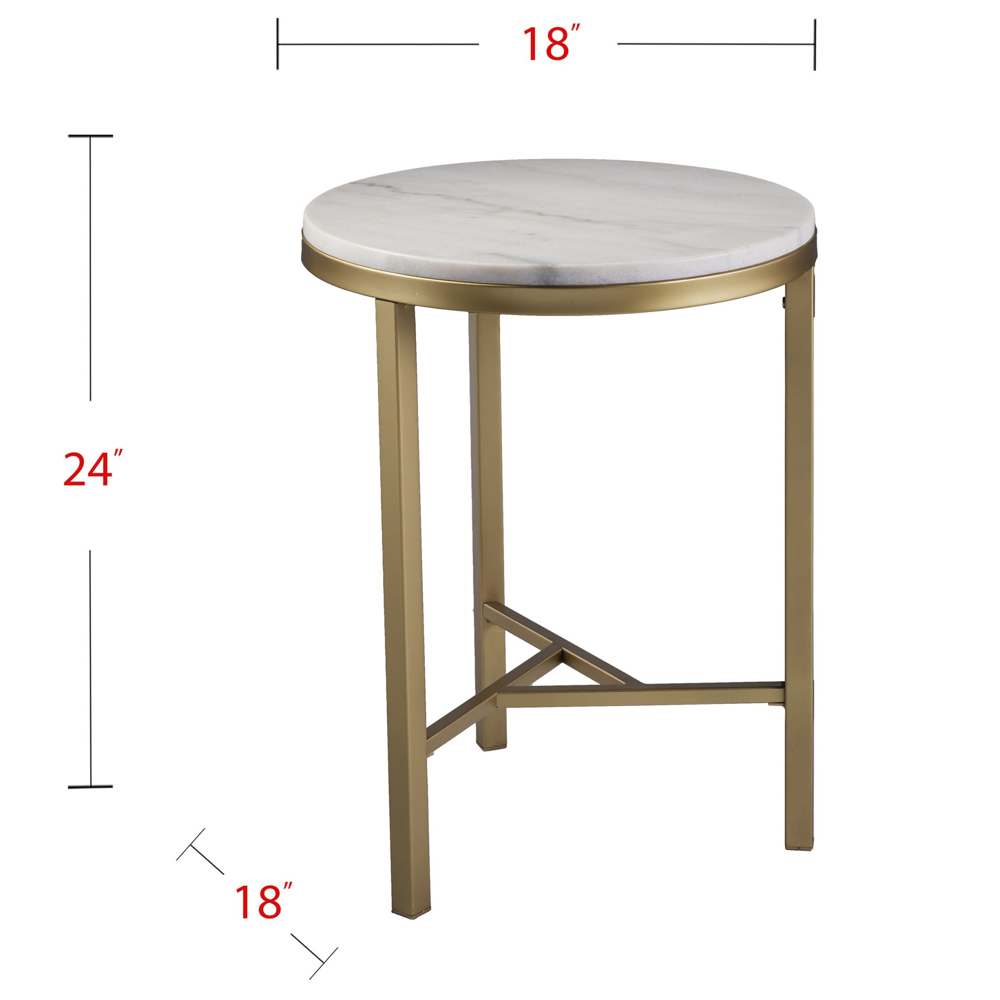 Show off your exquisite taste with this 24" champagne genuine marble look and iron rectangular end table. Artfully crafted of metal, this beautiful design is chock-full of fine details. The champagne coloration runs throughout this good-looking iron and genuine marble look table. An ideal location for placing your snacks and drinks, and a place to keep your lamp, frames, or other accessories. This versatile table is a great accent for almost any room. 24" H x 18" W x 18" D