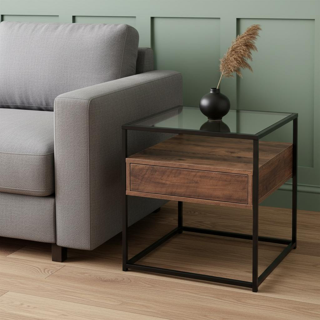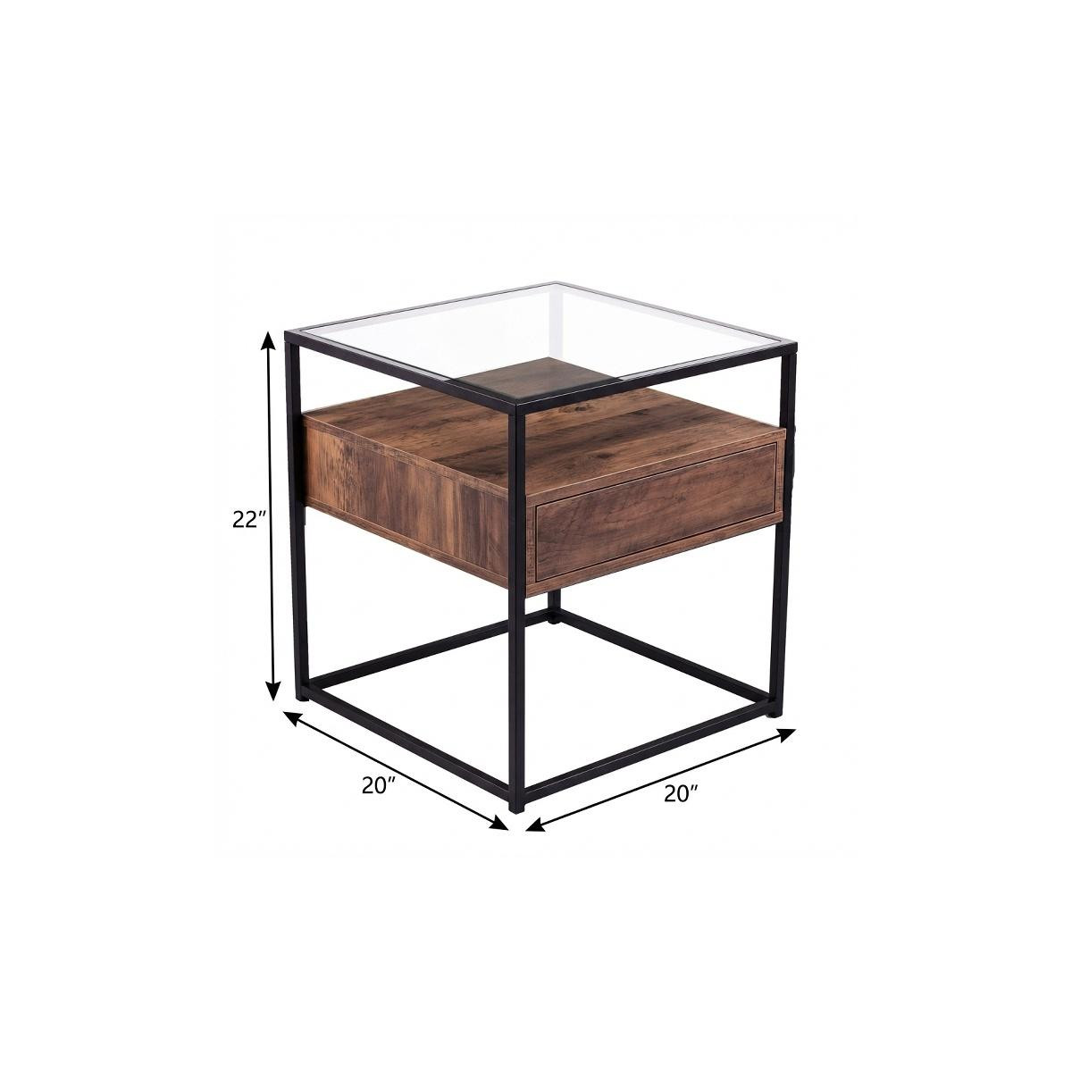 Optimize your space and add some charm to your room with the 22" black glass and iron square end table with drawer with shelf. Artfully crafted of metal, this beautiful design is chock-full of fine details. The black coloration runs throughout this good-looking iron and glass table. Help to keep your space organized with the included single shelf. Includes a single easy pull out drawer for handy storage of life's little essentials. An ideal location for placing your snacks and drinks, and a place to keep your lamp, frames, or other accessories. You can match it with other pieces to get the ideal look for your place. 22" H x 20" W x 20" D