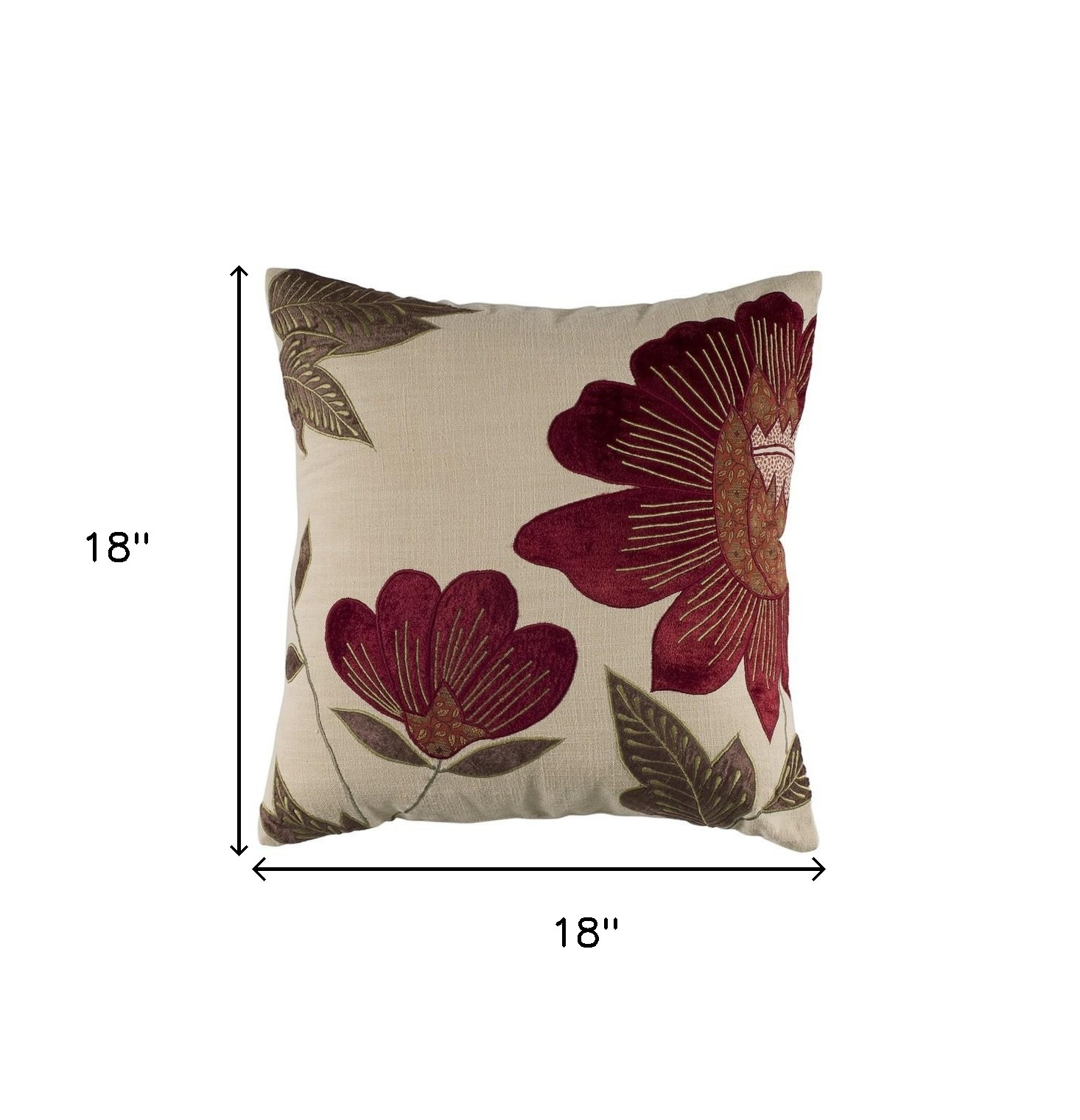 Unique and decorative, this comfortable 18-inch beige and red floral throw pillow with embroidery will leave a lasting impression. Decorative touches that are embroidered give this great design some beautiful texture along with a hand-crafted look and feel. Super soft and built to hold its shape, this polyester pillow is a great option. Great to use on its own or mix with other decorations for the perfect look. A great decorative accessory for your favorite chair, to accent your sofa, or to use as part of your bed ensemble. 18-inch H x 18-inch W x 6.25-inch D