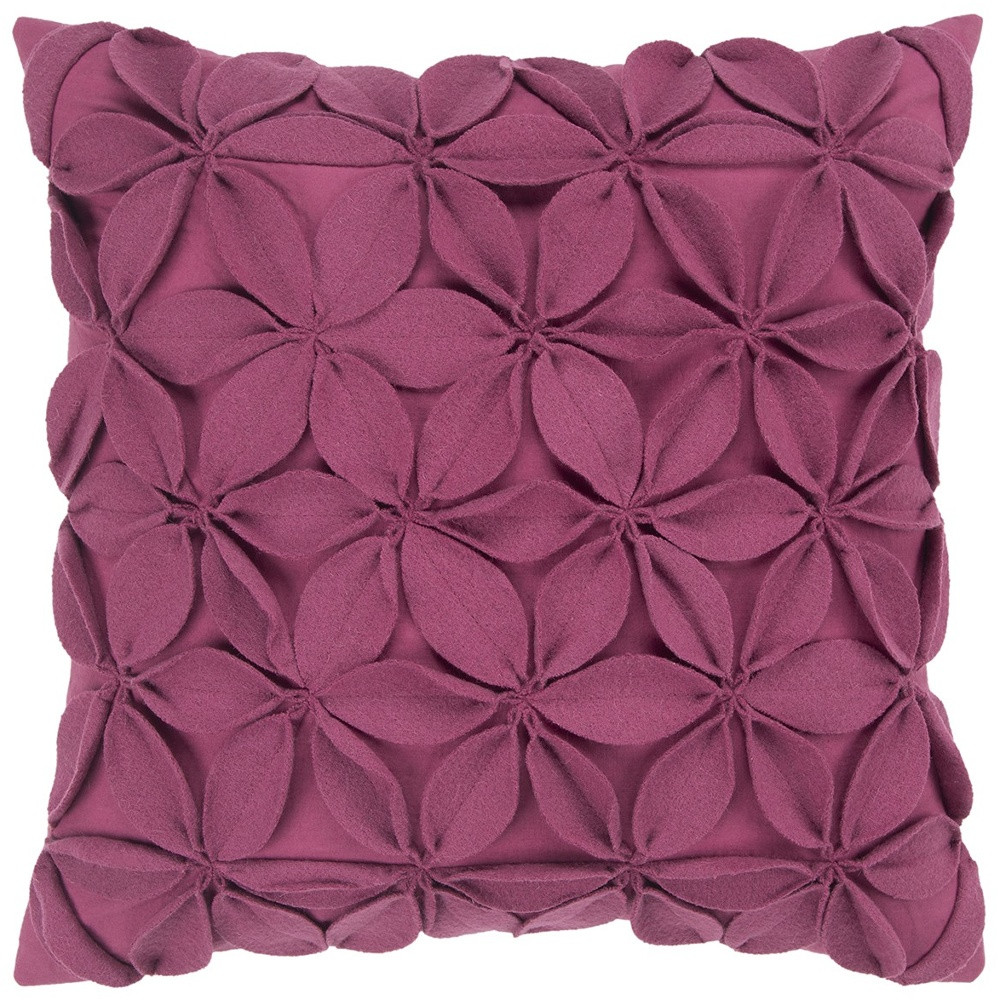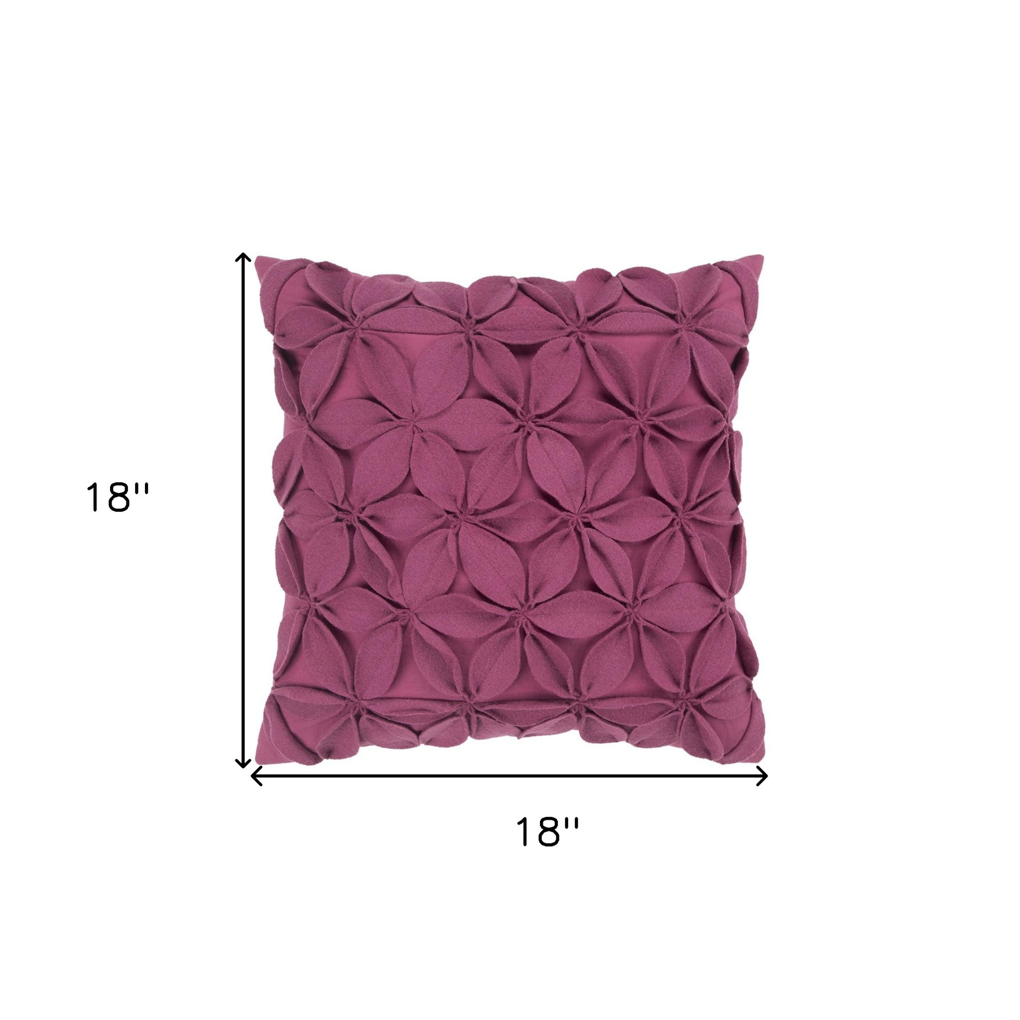 The visually intriguing texture of this 18-inch Magenta solid color floral dimensional applique throw pillow will undeniably serve as an eye-catching accent in your living space. This pretty decorative pillow is expertly covered with a high grade blend of wool and cotton with felt applied floral pinwheels on the front for a fresh and unique look. Super soft and built to hold its shape, this polyester filled pillow is a great option.18-inch H x 18-inch W x 6.25-inch D