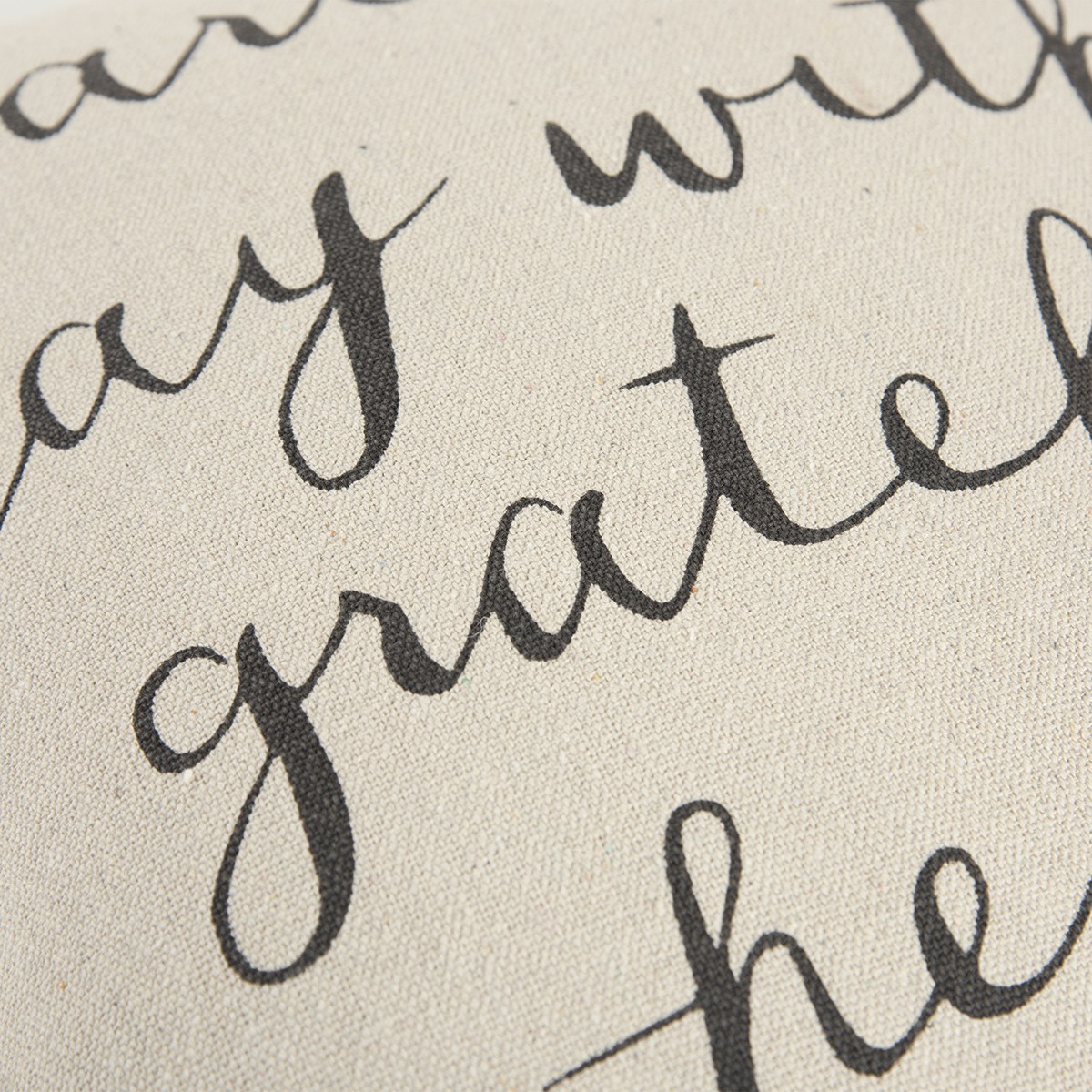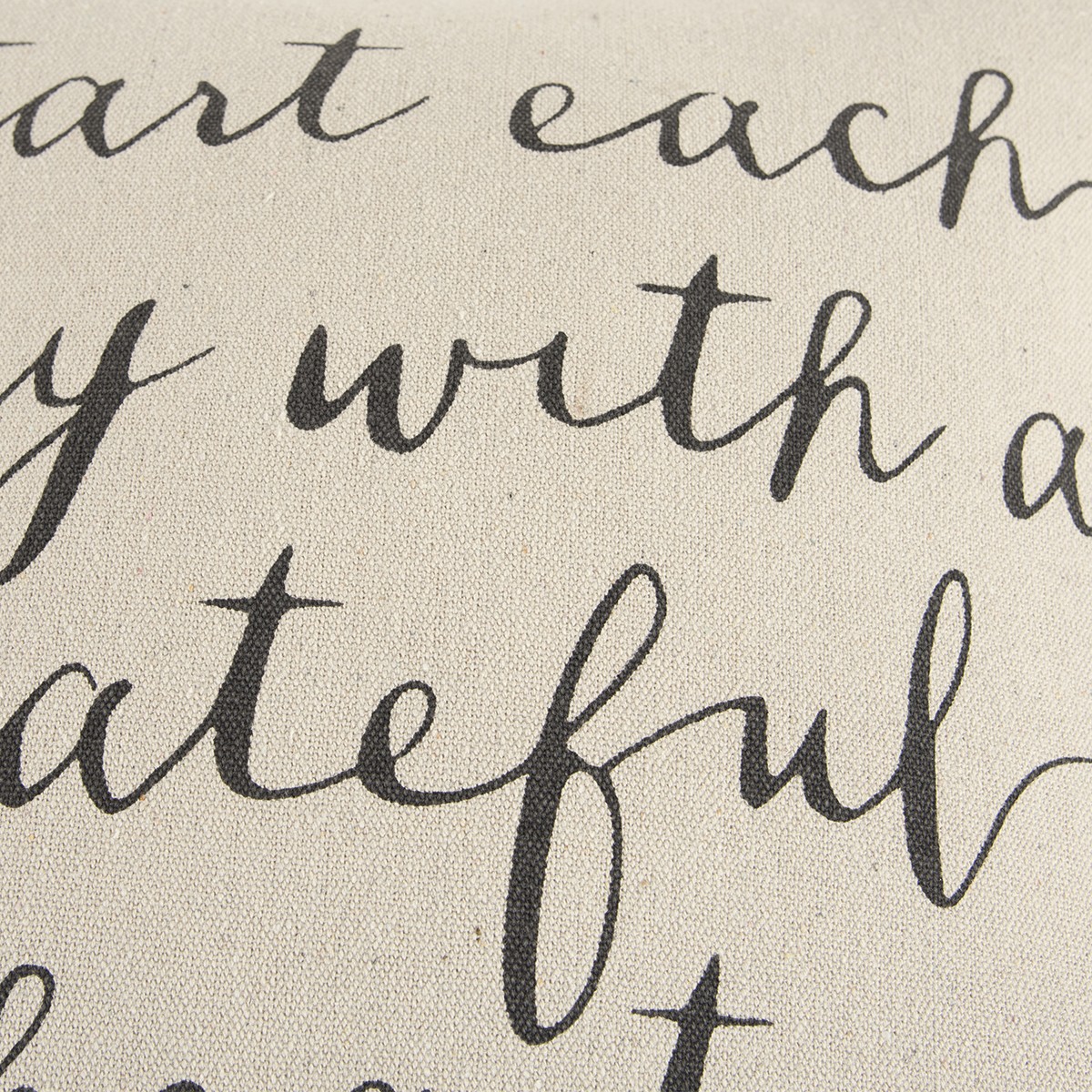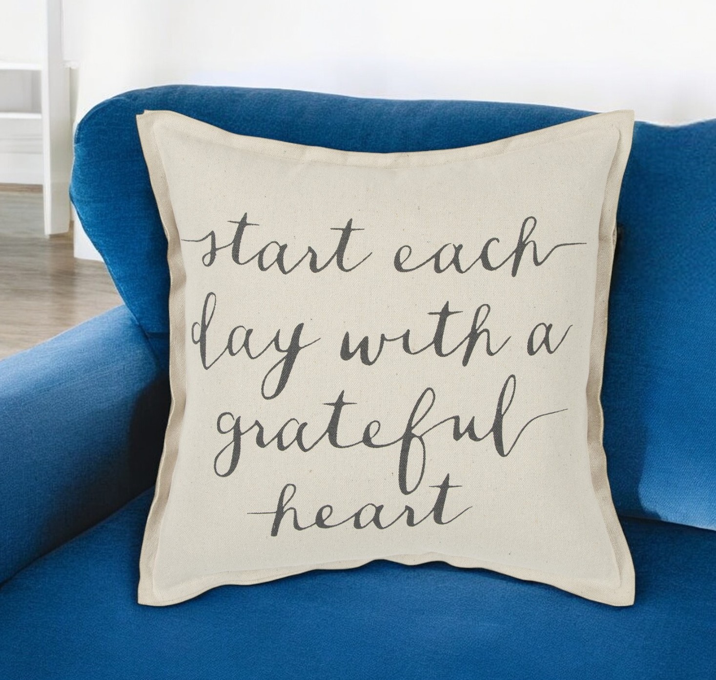 This 20-inch natural and gray sentimental cotton throw pillow will add a beautiful decorative accent to your decor. This natural and gray hued piece represents quality construction, expertly made from a durable cotton cover and then filled with polyester fill that is designed to keep its shape. Emblazoned with the text "Start each day with a grateful heart", this pillow adds some visual interest and decor to your space. 20-inch H x 20-inch W x 6.25-inch D