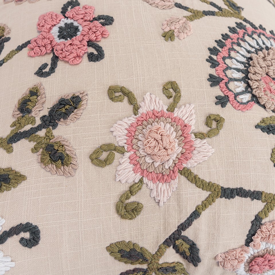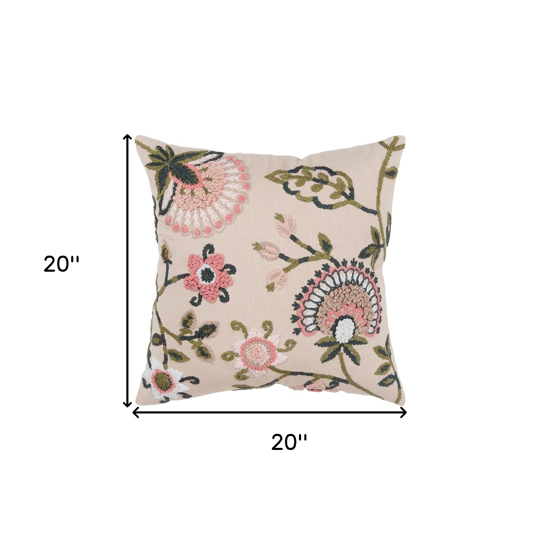 The 20-inch natural pink and green botanical cotton throw pillow with embroidery is the perfect decorative accessory for your home. The heavy embroidery in shades of blush pink, sage, and moss green creates a wonderful eye-soothing color combination on the soft natural blush base, making the vining and bloom more realistic. Super soft and built to hold its shape, this polyester-filled pillow is a great option. Decorative throw pillows not only add color and dimension to your space but can be comfy and supportive when you are lounging and cuddling as well. 20.00-inch h x 20.00-inch w x 0.50-inch d.