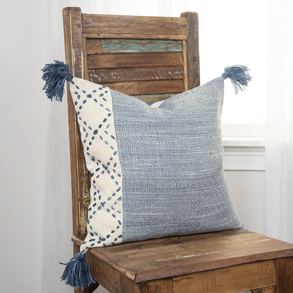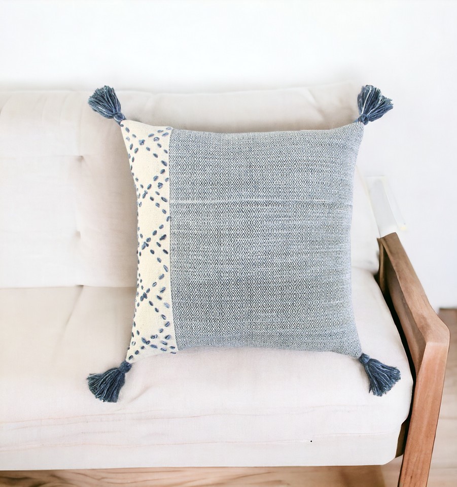 Bring a modern bohemian aesthetic to your living space with this sophisticatedly designed 20-inch blue and ivory herringbone cotton throw pillow with tassels. Charming decorative kantha embroidered stitching and tassels give this pillow interest, texture, and a hand-crafted look and feel. Super soft and built to hold its shape, this polyester filled decorative pillow is a great option to add color and dimension to your space. 20-inch H x 20-inch W x 6.25-inch D