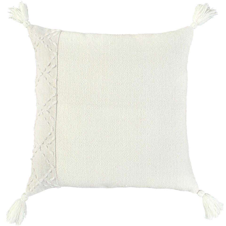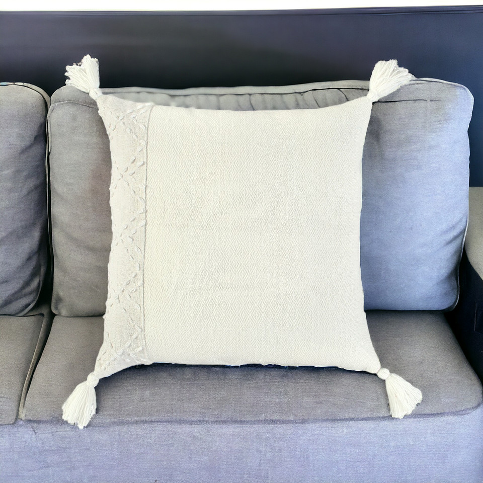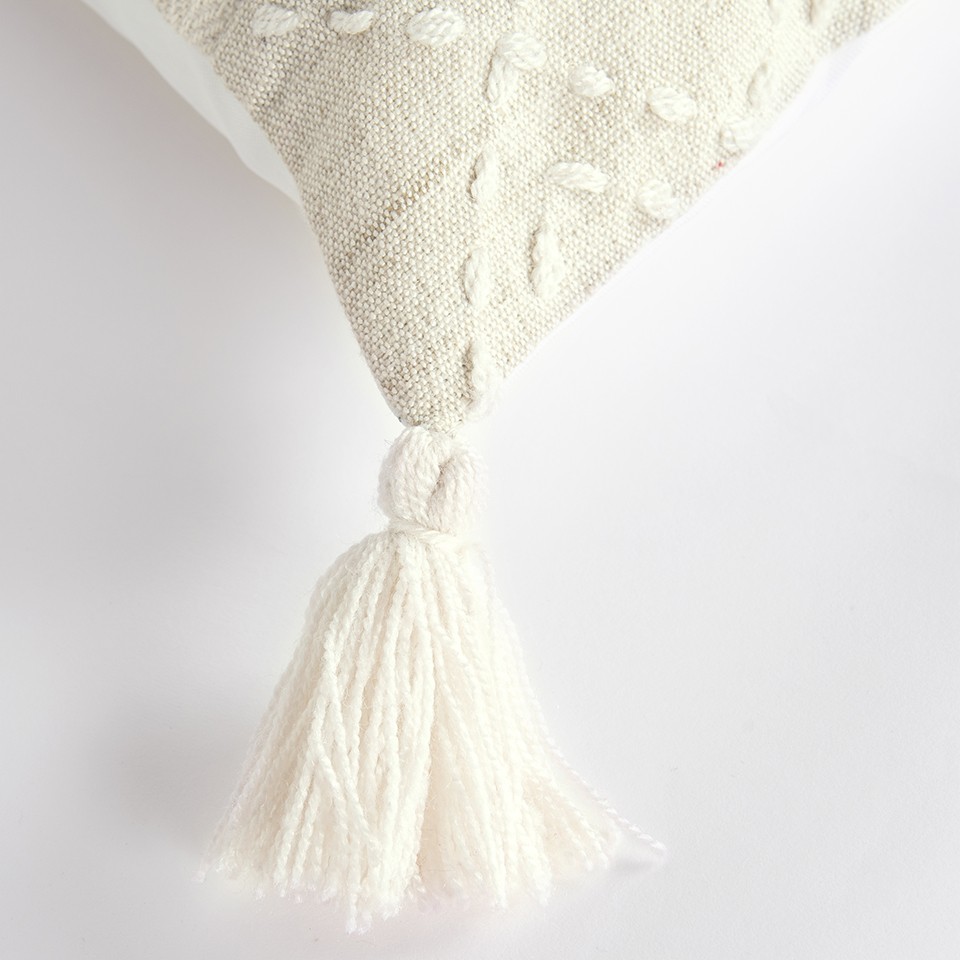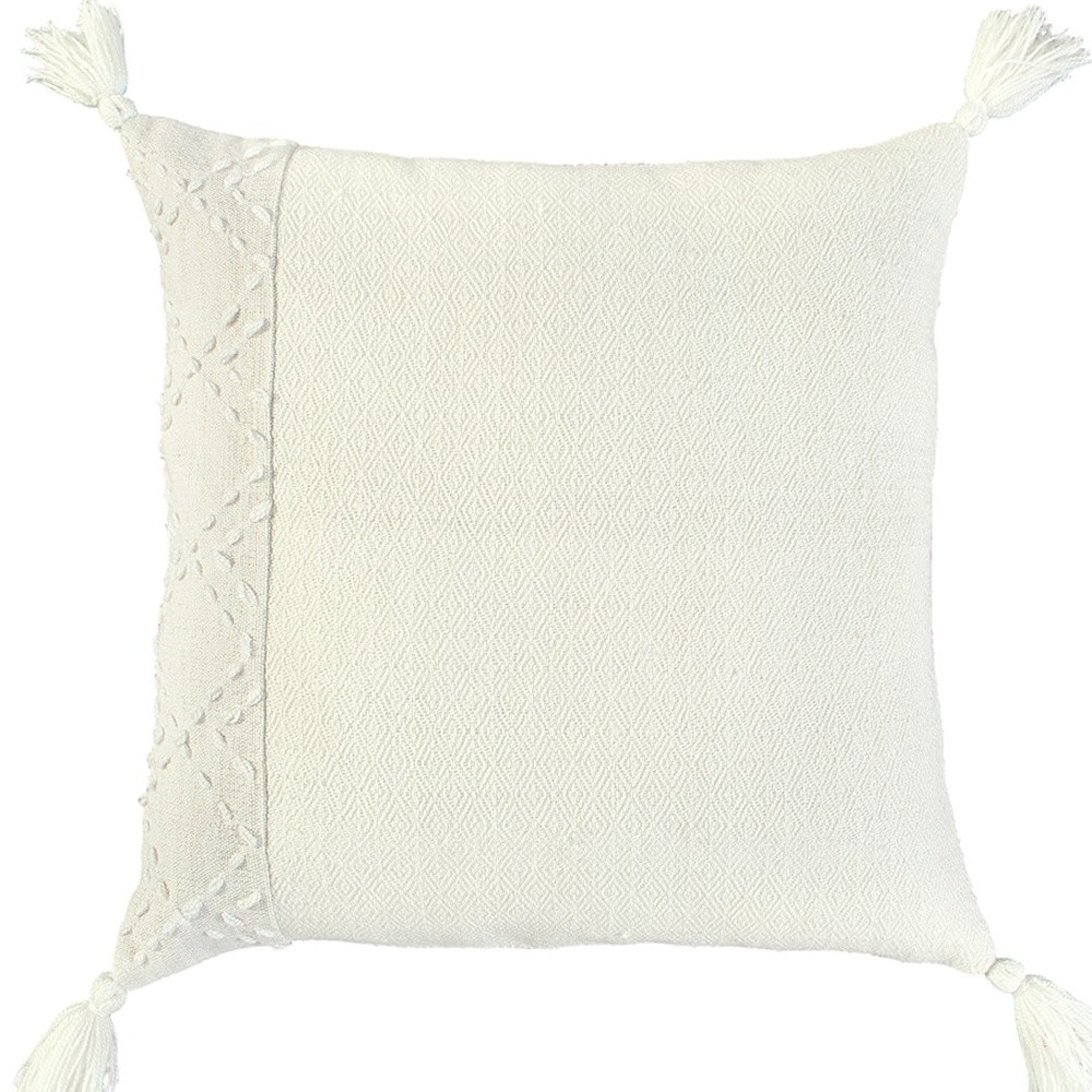 Bring a modern bohemian aesthetic to your living space with this sophisticatedly designed 20-inch ivory tone-on-tone herringbone cotton throw pillow with tassels. Charming decorative kantha embroidered stitching and tassels give this pillow interest, texture, and a hand-crafted look and feel. Super soft and built to hold its shape, this polyester filled decorative pillow is a great option to add color and dimension to your space. 20-inch H x 20-inch W x 6.25-inch D