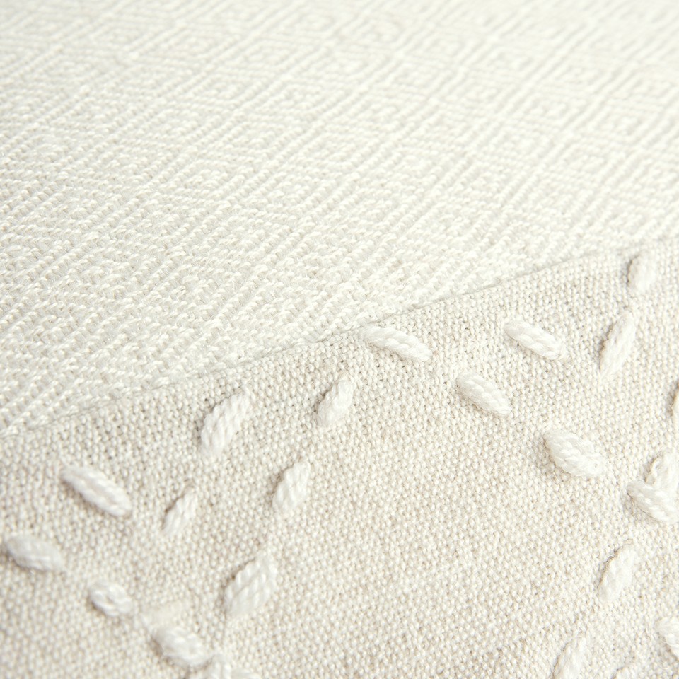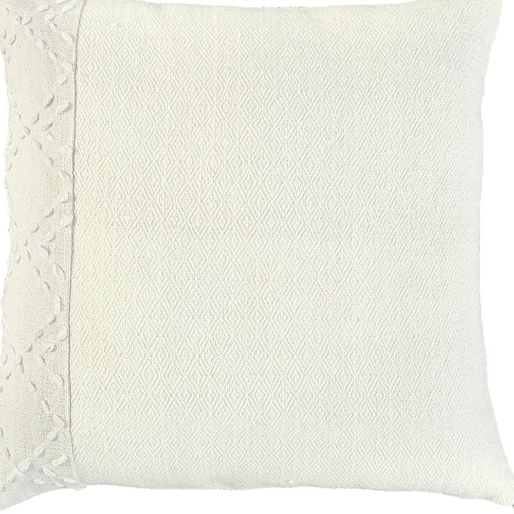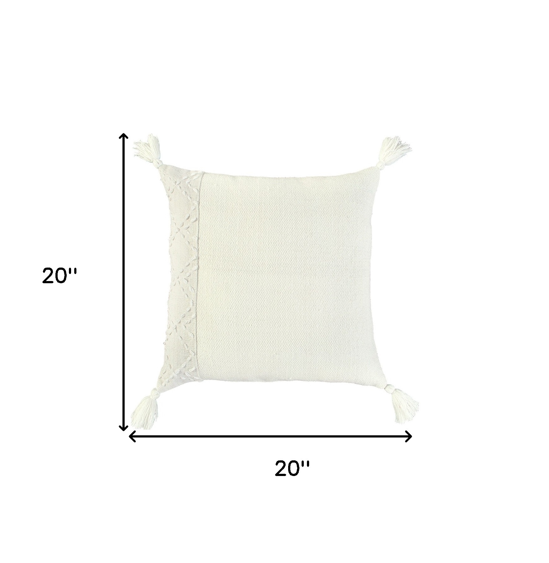 Bring a modern bohemian aesthetic to your living space with this sophisticatedly designed 20-inch ivory tone-on-tone herringbone cotton throw pillow with tassels. Charming decorative kantha embroidered stitching and tassels give this pillow interest, texture, and a hand-crafted look and feel. Super soft and built to hold its shape, this polyester filled decorative pillow is a great option to add color and dimension to your space. 20-inch H x 20-inch W x 6.25-inch D
