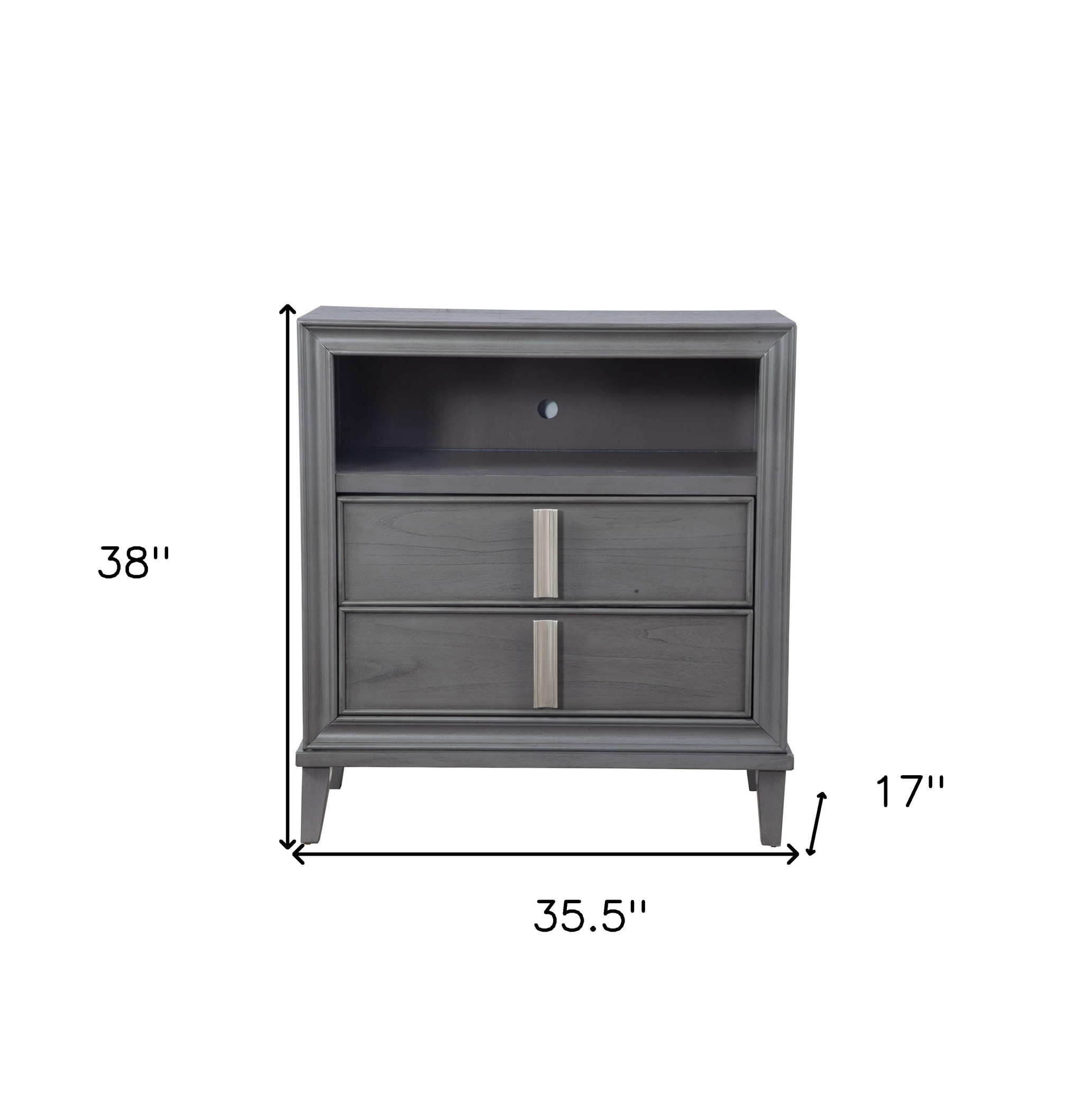 Create the ultimate blend of style, function, and design with this 36" gray pine poplar solids with mindy and veneer open shelving tv stand. To add to the versatility, this piece features open non-concealed storage that can be used for not only storage but display as well. A cord cut out hole is ideal for wire and cable managment to keep your space looking tidy. Convert your room into a special place with your favorite collectibles and TV accessories that is suitable for living room, bedroom, or office. 38" H x 35.5" W x 17" D