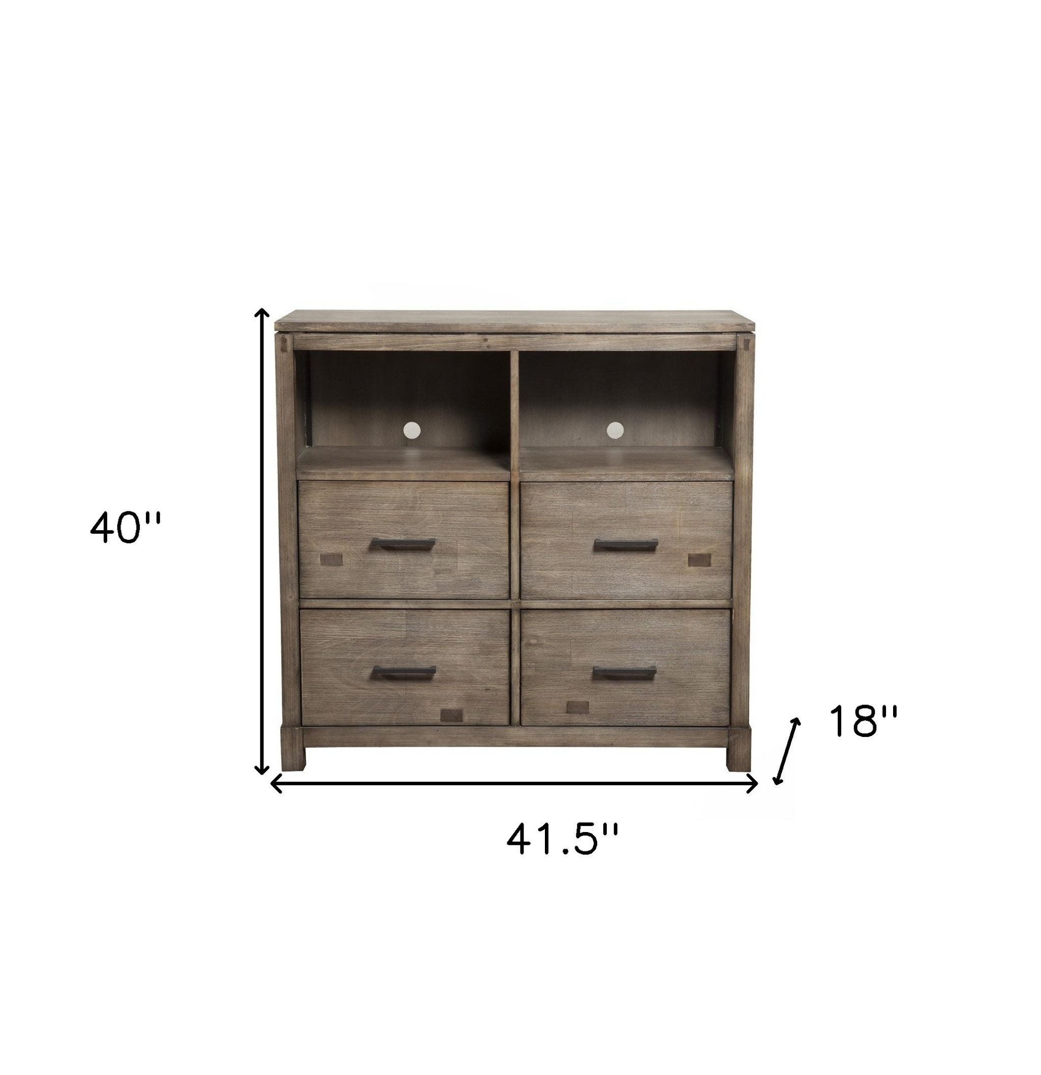 Ready to be enjoyed in your living room, family room, or recreation room, this 42-inch brown solid wood open shelving tv stand is a practical and good looking piece of furniture that will help to anchor your room. To add to the versatility, this piece features open non-concealed storage that can be used for not only storage but display as well. A built-in cable and wire management helps to keep those unseemly wires at bay. Ideal for tv placement and storage in your living room, bedroom or office. 40-inch H x 41.5-inch W x 18-inch D