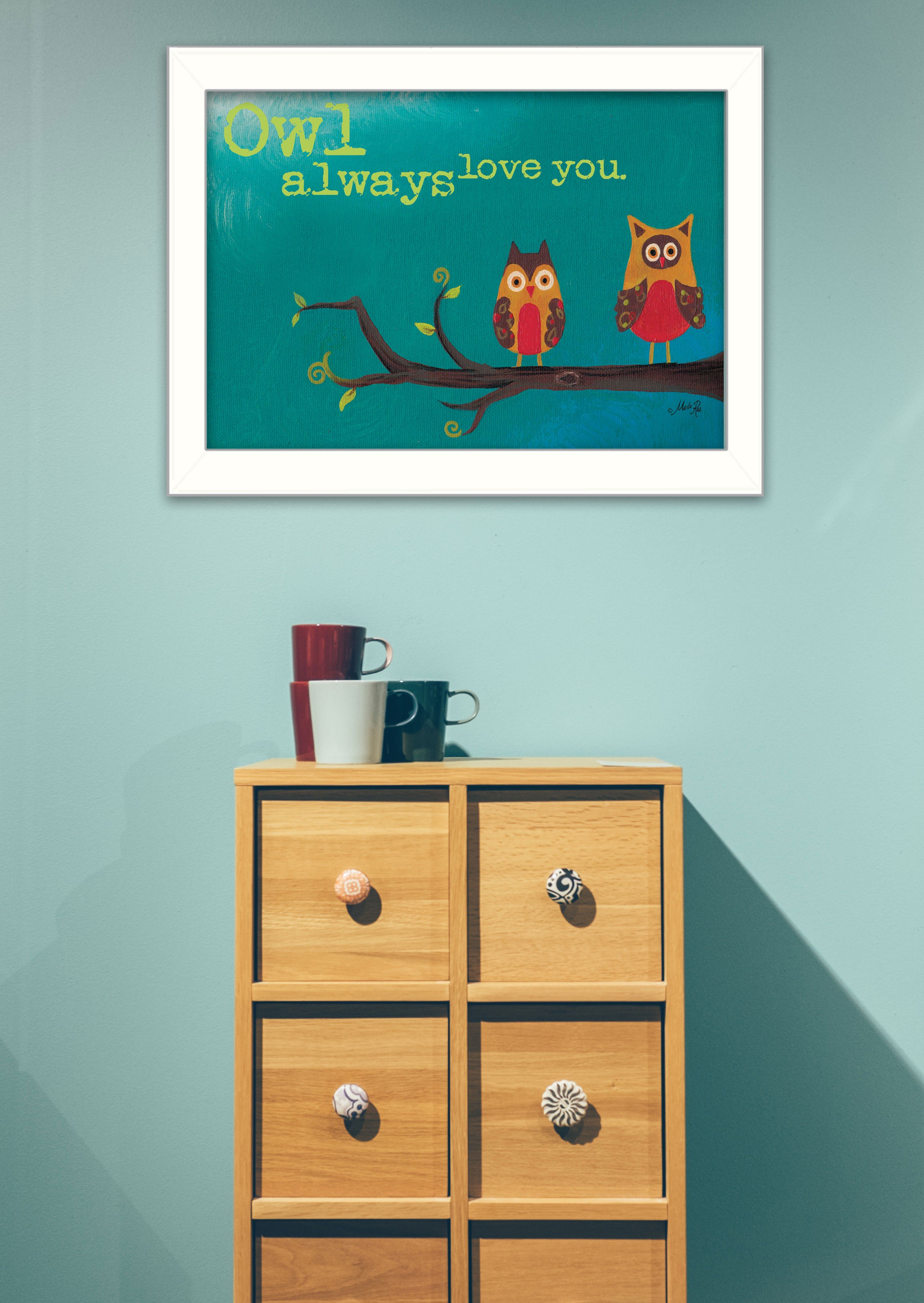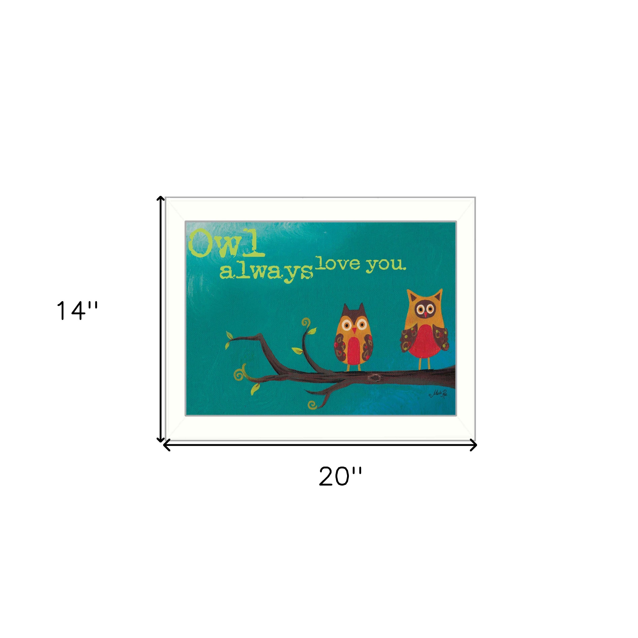 The owl always love you 1 white framed print wall art is the perfect decorative accessory for your home. Update your walls with this woodland animal decor. This print is a visual artistic expression that allows you to decorate your space in style. Reproduced for you on paper, this hanging decorative accent will be a trendy and fashionable way to dress your walls. Hang on your wall to add some up to date fashion and decoration. Instantly liven up your space with this art that brings color and dimension to your walls. 14-inch H x 20-inch W x 1-inch D