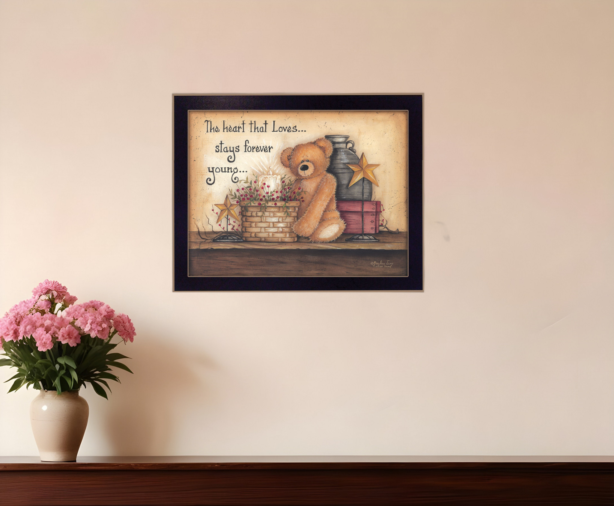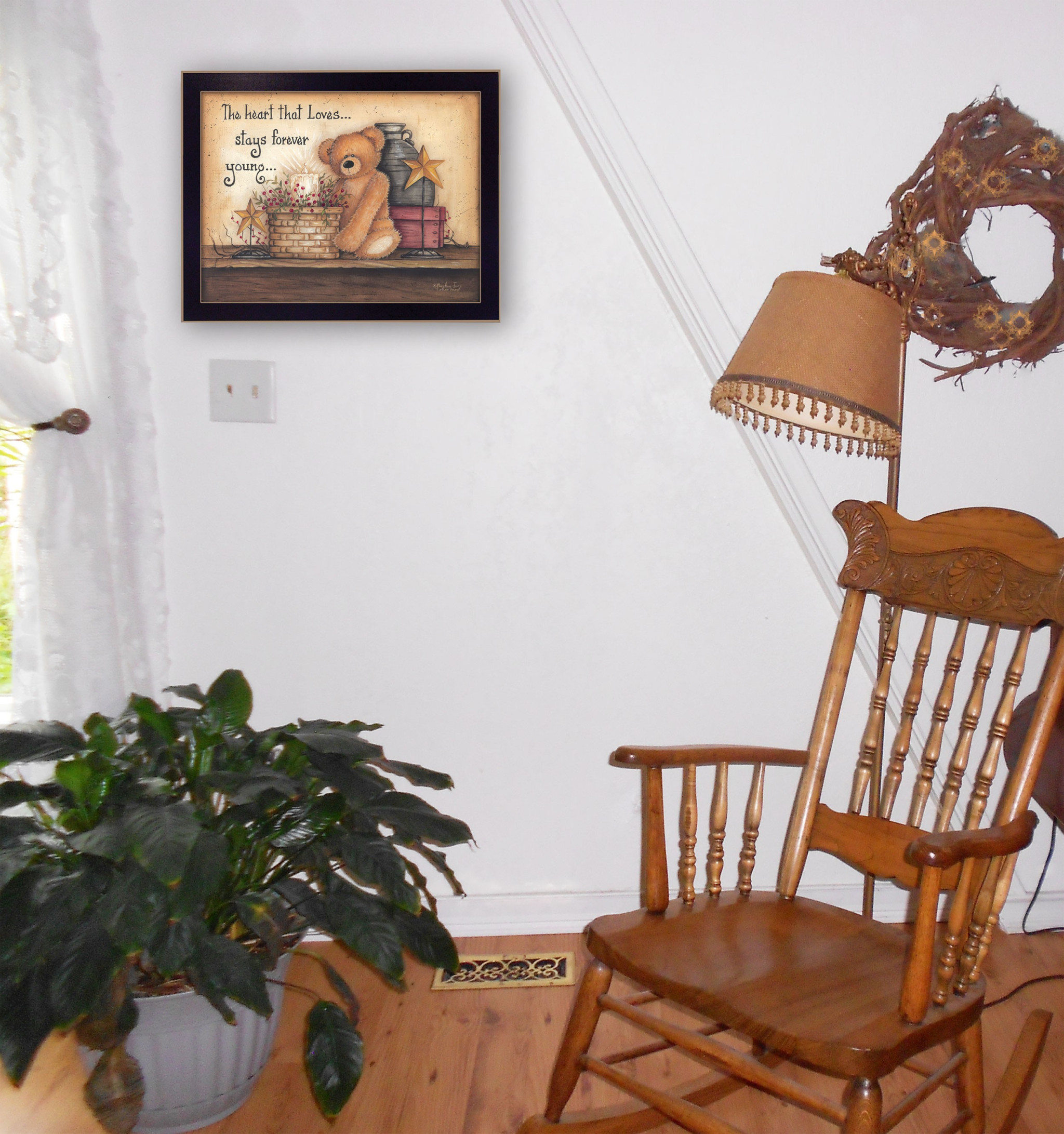Unique and decorative, this forever young 2 black framed print wall art will leave a lasting impression. This print is a visual artistic expression that allows you to decorate your space in style. Reproduced for you on paper, this hanging decorative accent will be a trendy and fashionable way to dress your walls. Hang on your wall to add some up to date fashion and decoration. Utilize this opportunity to create a focal point in the room with this fabulous wall decor option. 14-inch H x 18-inch W x 1-inch D