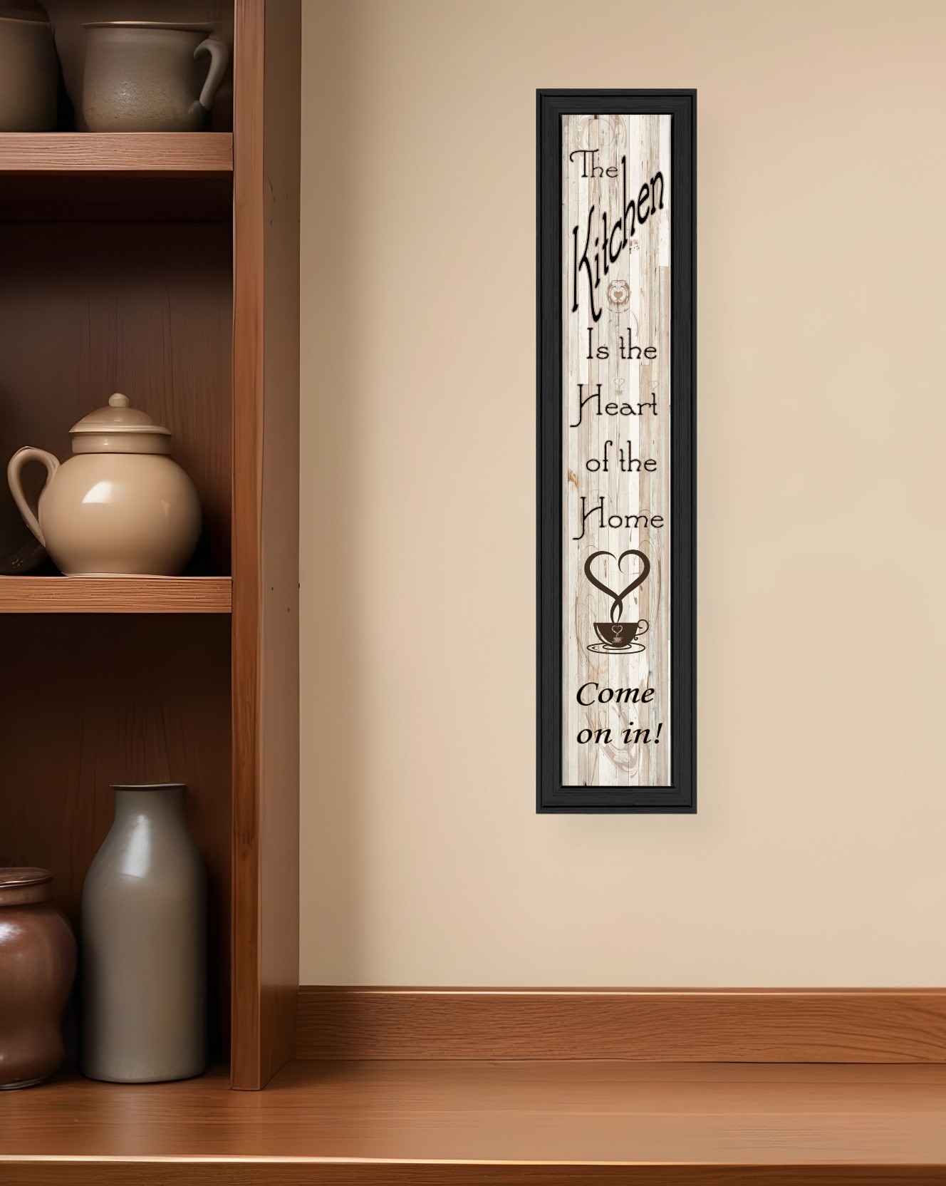 Unique and decorative, this kitchen is the heart of the home 8 black framed print kitchen wall art will leave a lasting impression. This print is a visual artistic expression that allows you to decorate your space in style. Reproduced for you on paper, this hanging decorative accent will be a trendy and fashionable way to dress your walls. Adding this hanging wall art to your space to make your room feel more finished and attractive. Instantly liven up your space with this art that brings color and dimension to your walls. 33-inch H x 8-inch W x 1-inch D