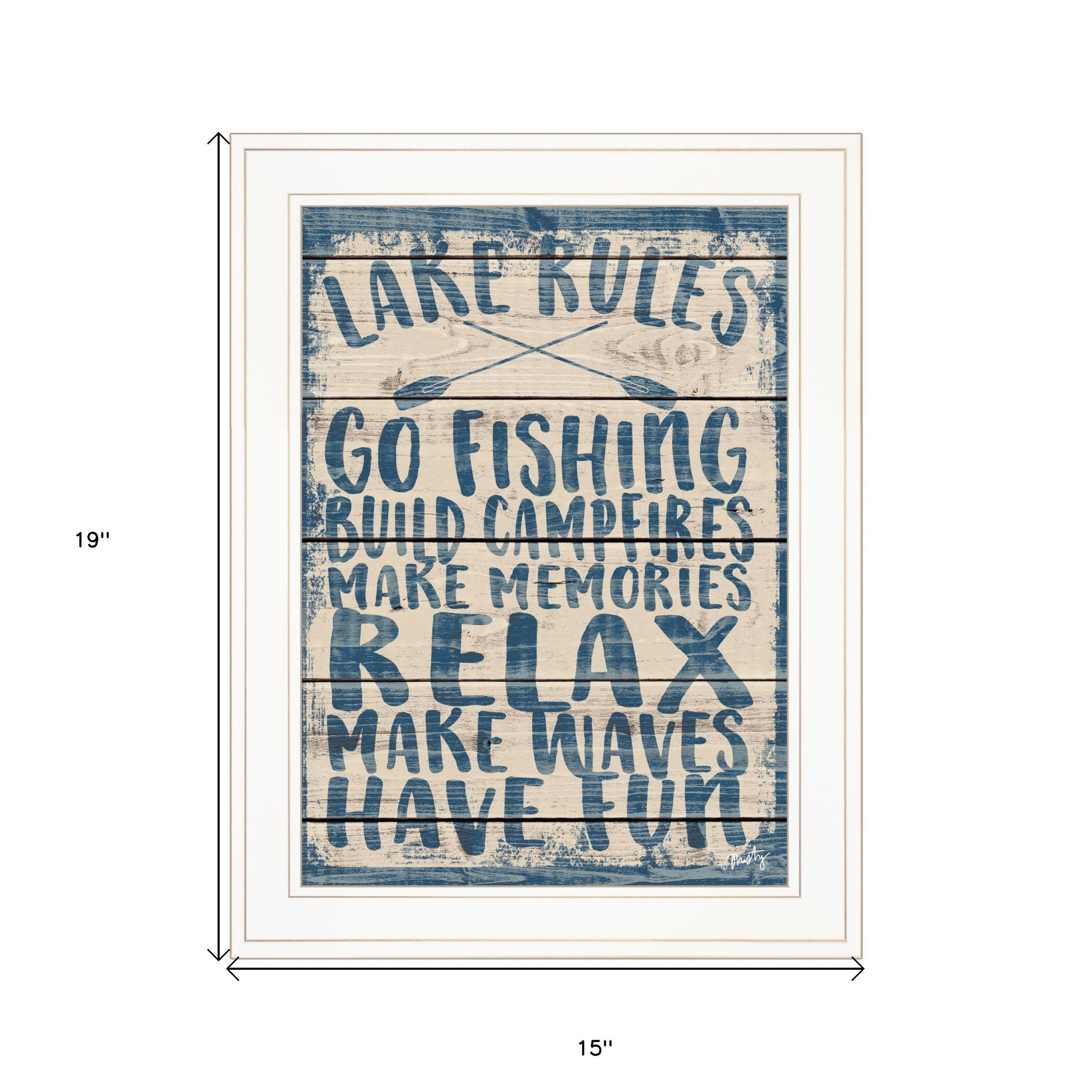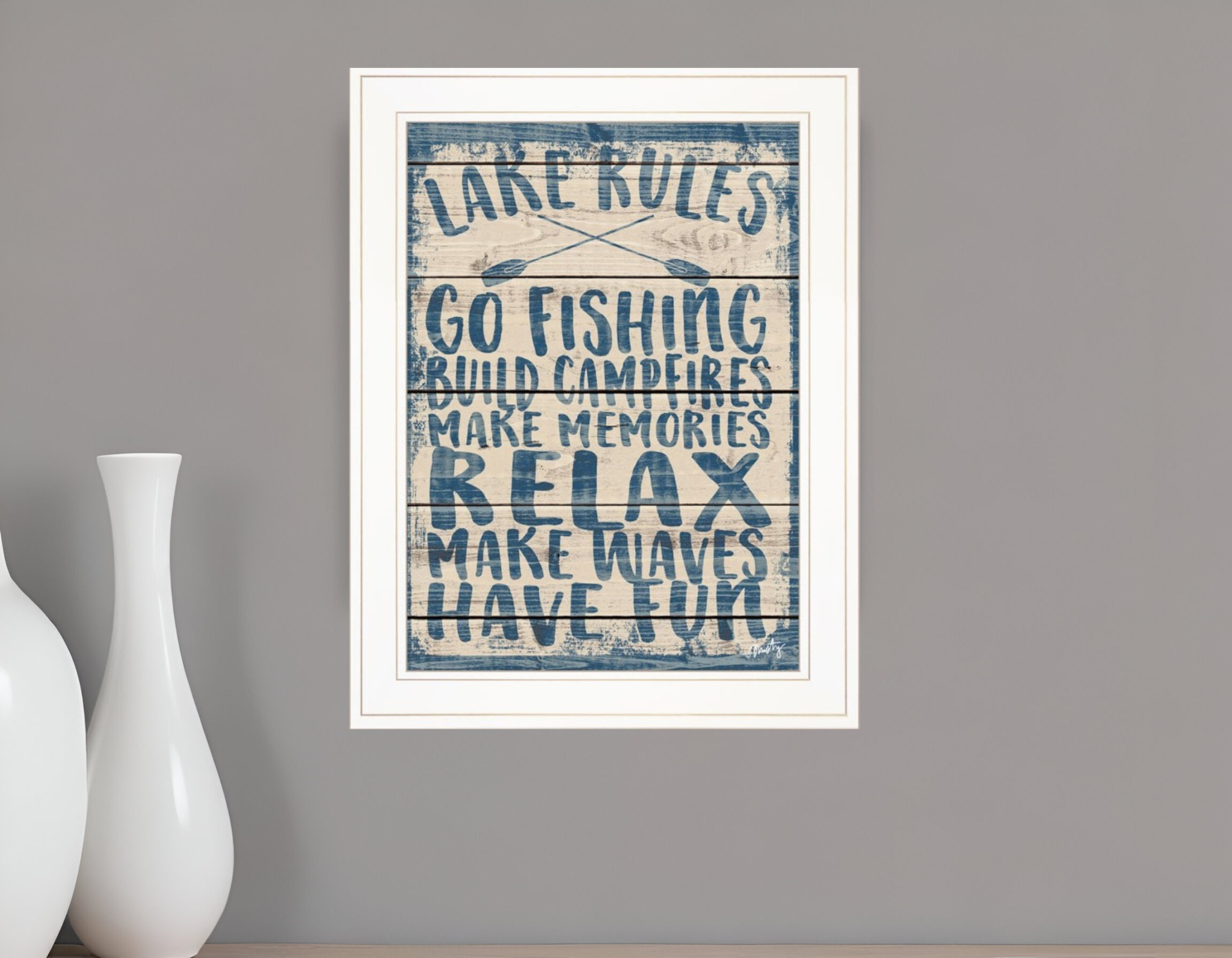 This lake rules 1 white framed print wall art will add a beautiful decorative accent to your decor. This print is a visual artistic expression that allows you to decorate your space in style. Reproduced for you on paper, this hanging decorative accent will be a trendy and fashionable way to dress your walls. Adding this hanging wall art to your space to make your room feel more finished and attractive. Instantly liven up your space with this art that brings color and dimension to your walls. 19-inch H x 15-inch W x 1-inch D