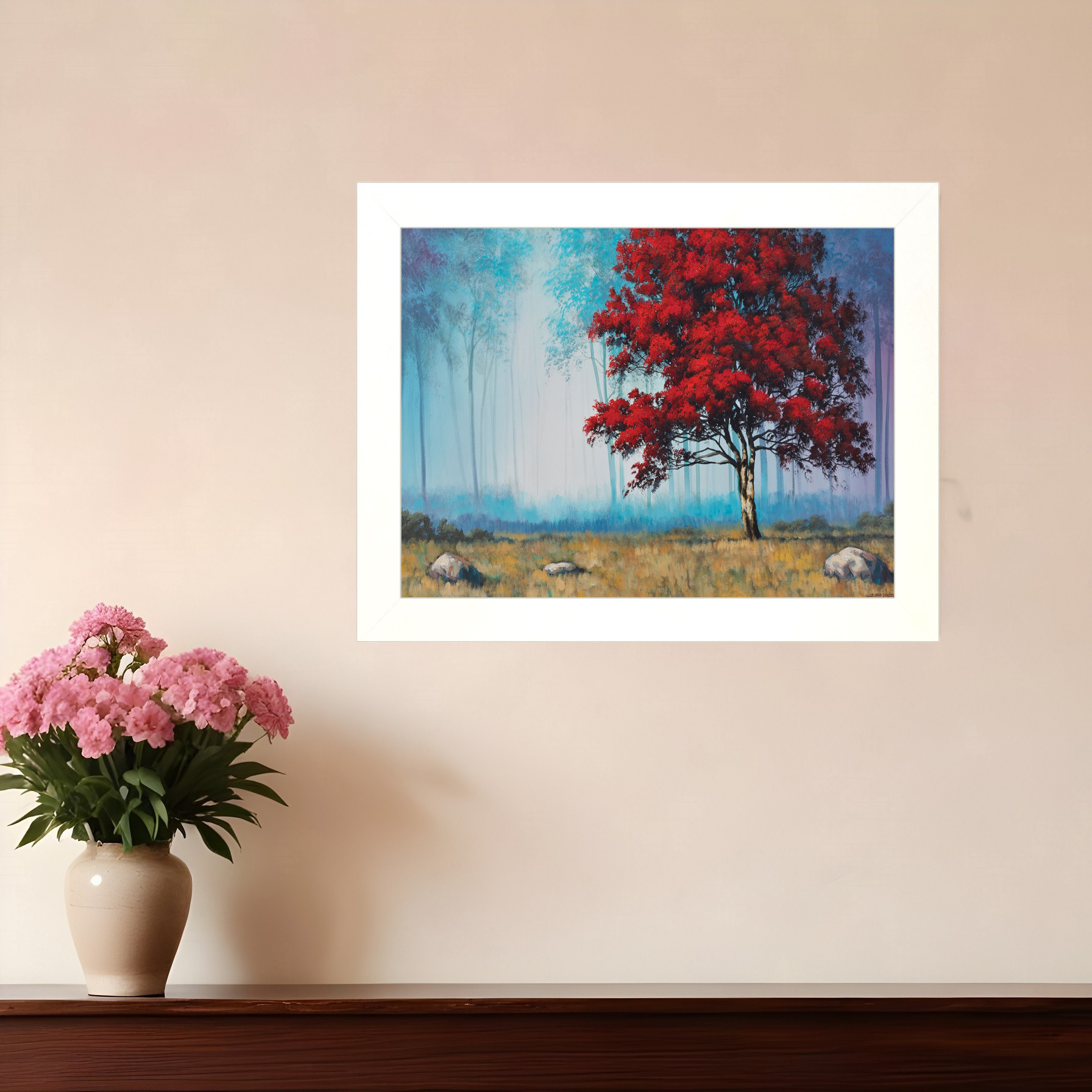 Add an air of fashion to your room and rejuvenate the space with this red tree 3 white framed print wall art. This print is a visual artistic expression that allows you to decorate your space in style. Reproduced for you on paper, this hanging decorative accent will be a trendy and fashionable way to dress your walls. Adding this hanging wall art to your space to make your room feel more finished and attractive. Utilize this opportunity to create a focal point in the room with this fabulous wall decor option. 15-inch H x 19-inch W x 1-inch D
